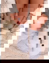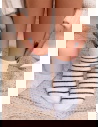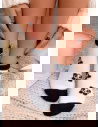 Skarpetki z ozdobnym motywem Nommi – wzór 5 to uroczy model, który łączy klasyczne paski z delikatnym, zwierzęcym akcentem. Jasna baza przełamana kontrastowym wzorem sprawia, że całość wygląda świeżo, lekko i bardzo przytulnie. Krótki fason świetnie podkreśla kostkę i nadaje stylizacji swobodnego charakteru.