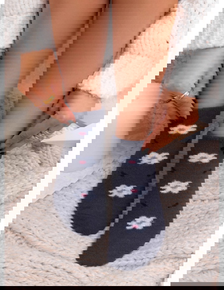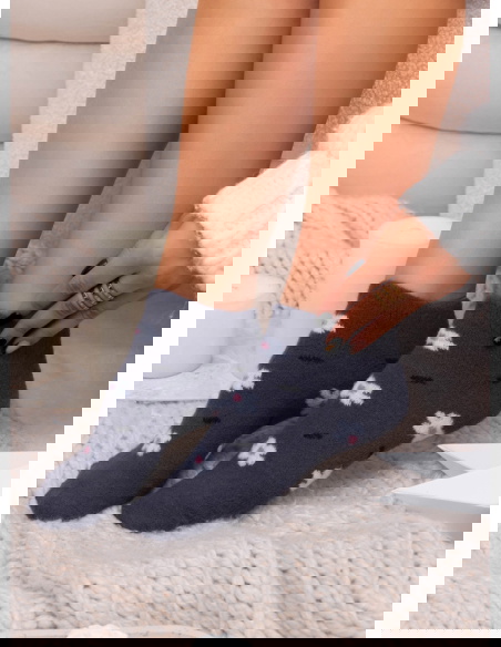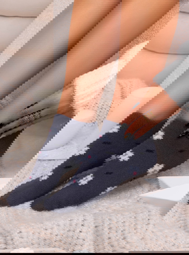 Grafitowe skarpetki z ozdobnym wzorem Navyia to spokojna, stonowana propozycja z delikatnym akcentem, który dodaje całości miękkości i uroku. Grafitowy odcień wygląda elegancko i neutralnie, a jasny, drobny wzór subtelnie przełamuje ciemną bazę, tworząc przyjemny wizualnie kontrast. Skarpetki prezentują się estetycznie i wpisują się w przytulny, codzienny klimat.