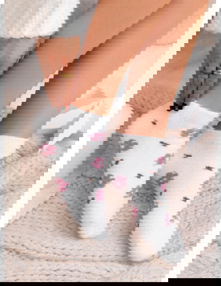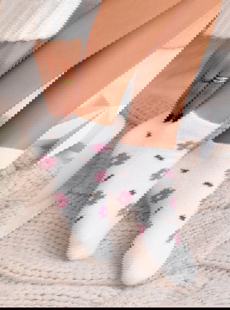Białe skarpetki z ozdobnym wzorem Navyia to lekka i przytulna propozycja, która łączy jasną bazę z delikatnym, dekoracyjnym akcentem. Śnieżnobiały kolor wygląda świeżo i estetycznie, a drobny wzór wprowadza miękkość oraz subtelną kobiecość. Całość prezentuje się czysto, harmonijnie i bardzo przyjemnie wizualnie.
