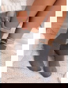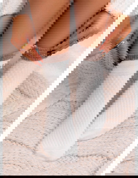 Prążkowana struktura porządkuje formę i sprawia, że całość prezentuje się spójnie oraz nowocześnie. To model, który dobrze odnajduje się zarówno w casualowych stylizacjach, jak i w bardziej swobodnych, domowych zestawach. Ozdobny napis jest dyskretny, ale zauważalny, dzięki czemu skarpetki nie są tylko dodatkiem, lecz świadomym elementem stylizacji.