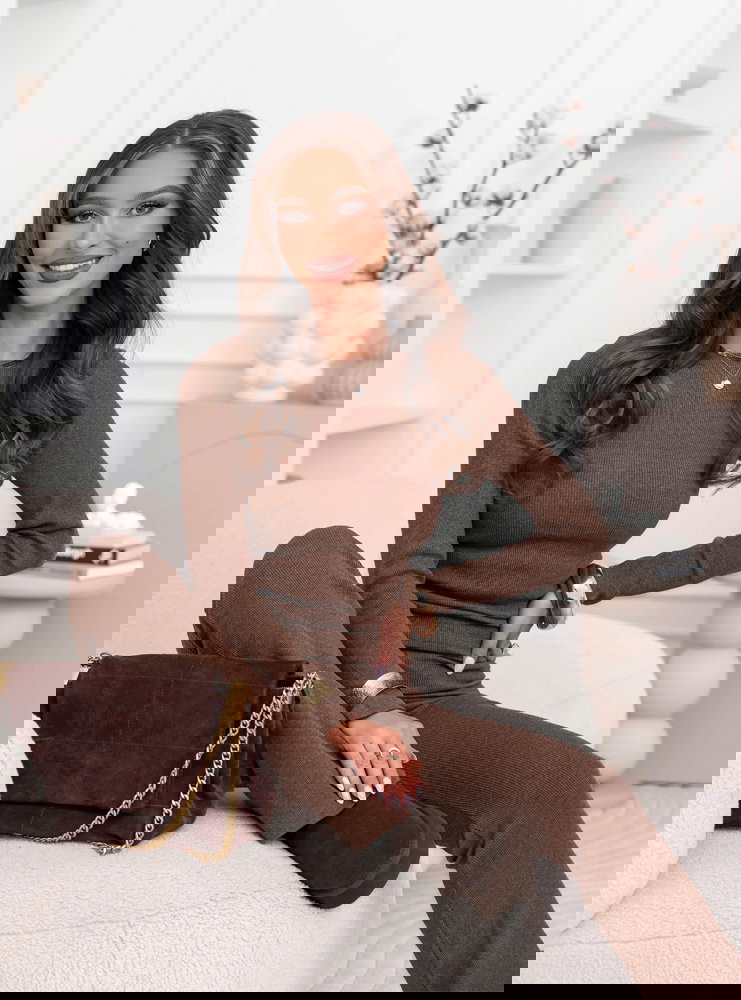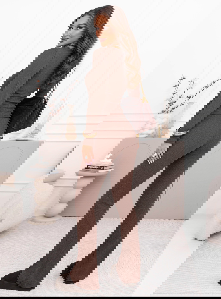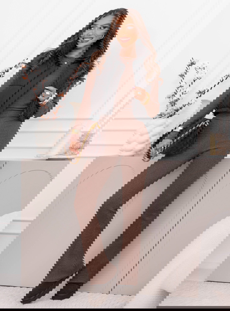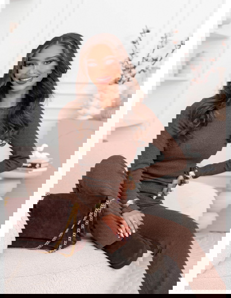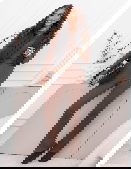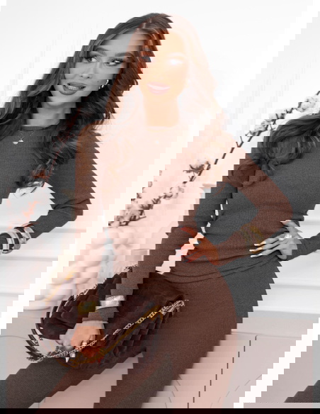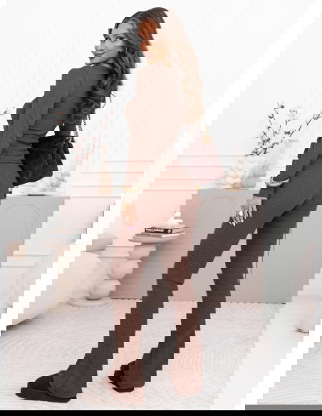 Prążkowany komplet dopasowana bluzka i spodnie Amirallia – mocha mousse to spójna, stylowa propozycja, która łączy wygodę z dopracowanym, kobiecym wyglądem. Prążkowana struktura nadaje całości uporządkowanej formy, a odcień mocha mousse prezentuje się ciepło, elegancko i bardzo nowocześnie. Dopasowany fason obu elementów pięknie podkreśla sylwetkę, tworząc harmonijną i smukłą linię.