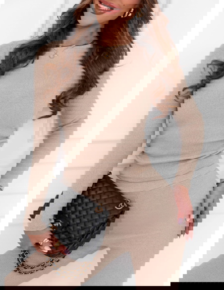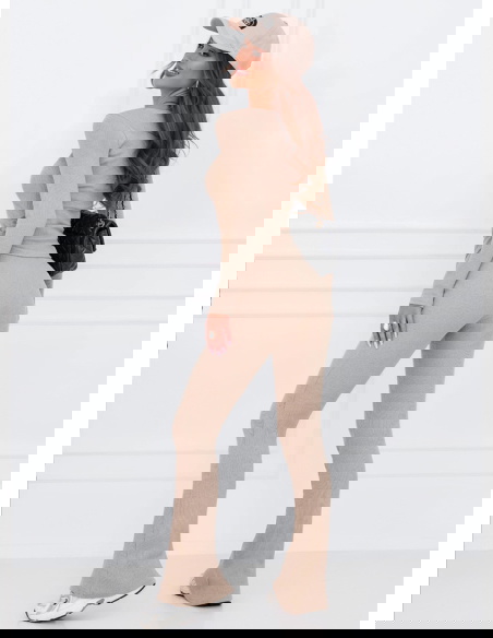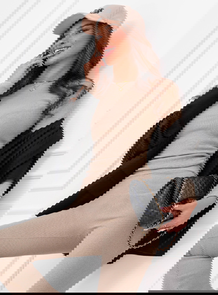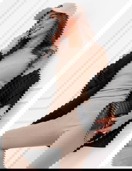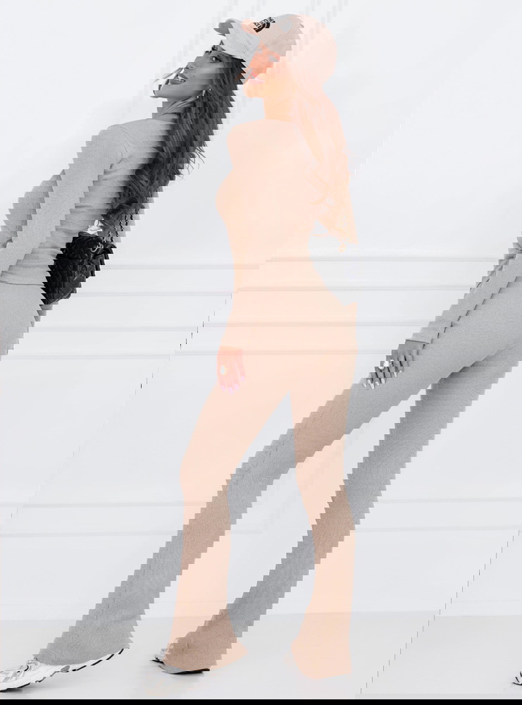 Beżowy prążkowany komplet dopasowana bluzka i spodnie Amirallia to elegancka, a jednocześnie bardzo uniwersalna propozycja, która świetnie odnajduje się w codziennych stylizacjach. Prążkowana struktura nadaje całości uporządkowanej, estetycznej formy, a beżowy odcień prezentuje się naturalnie, lekko i ponadczasowo. Dopasowany fason obu elementów pięknie podkreśla sylwetkę, tworząc spójną i harmonijną linię.