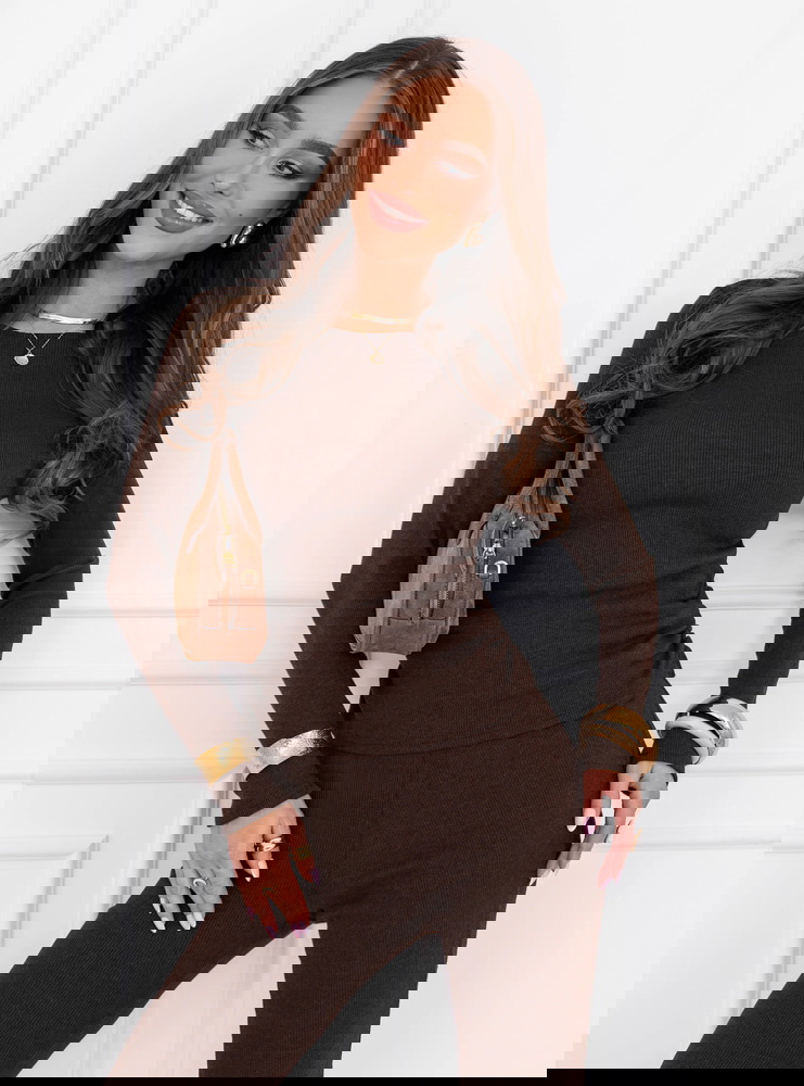Czekoladowy prążkowany komplet dopasowana bluzka i spodnie Amirallia