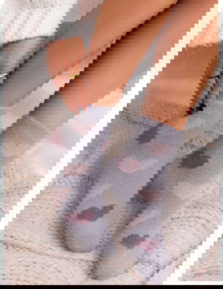 Szare skarpetki z ozdobnym wzorem Deannee to przytulna propozycja w stonowanej kolorystyce, przełamanej delikatnym, romantycznym akcentem. Miękki odcień szarości prezentuje się spokojnie i uniwersalnie, a jasne sercowe motywy dodają całości lekkości oraz kobiecego uroku. Skarpetki wyglądają estetycznie i idealnie wpisują się w codzienny, domowy klimat.