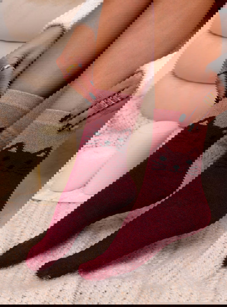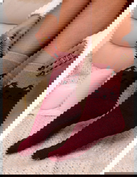 Bordowe skarpetki z ozdobnym wzorem Guyanna to propozycja, która łączy intensywny kolor z uroczym motywem kota. Kontrastowe połączenie bordowej bazy z jaśniejszą górą nadaje im wyrazistego, a jednocześnie przytulnego charakteru. To model, który od razu przyciąga spojrzenia.