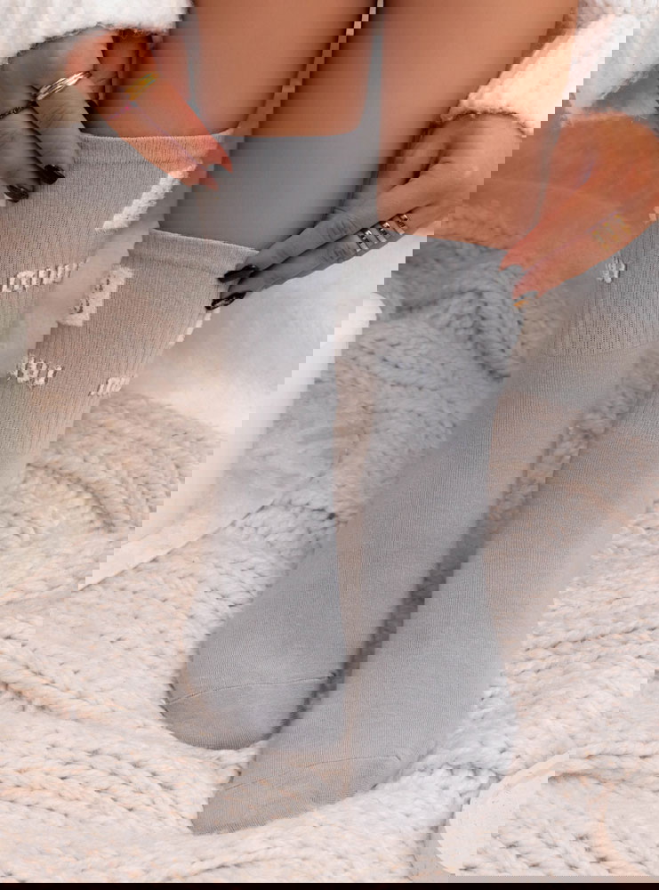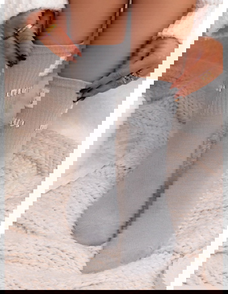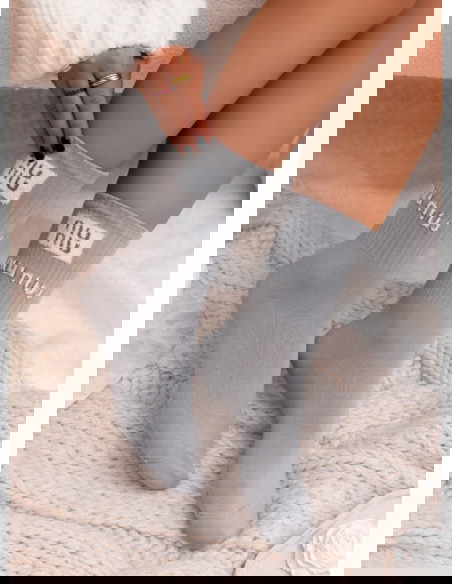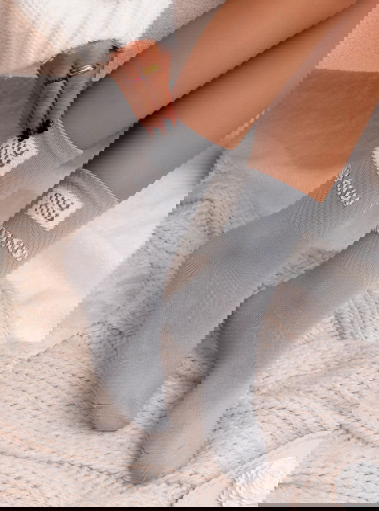 Szare skarpetki z ozdobnym wzorem Jasmynne to minimalistyczna propozycja z modowym akcentem, który subtelnie wyróżnia stylizację. Jasny, neutralny odcień świetnie komponuje się z codzienną garderobą, a kontrastowy napis przy górnej części dodaje im nowoczesnego charakteru. To model, który łączy wygodę z wyrazistym detalem.
