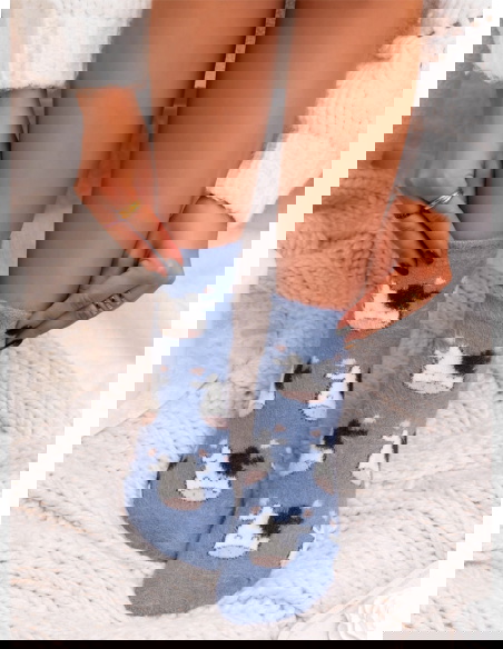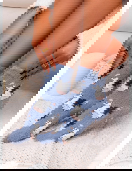 Niebieskie miękkie skarpetki damskie Deaestaa to przytulny model, który od razu przyciąga uwagę delikatnym kolorem i uroczym wzorem. Miękka, puszysta struktura nadaje im wyjątkowej lekkości, a jasnoniebieski odcień wprowadza do stylizacji subtelną świeżość. To propozycja, która łączy wygodę z dziewczęcym akcentem.