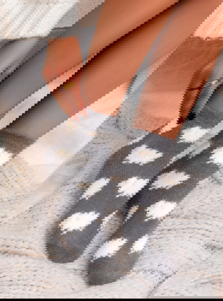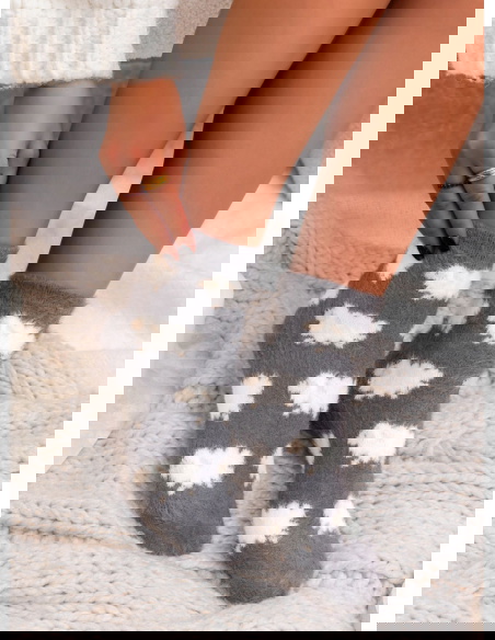 Grafitowe miękkie skarpetki damskie Deaestaa to przytulny model, który łączy klasyczny kolor z subtelnym, jasnym wzorem. Grafitowa baza wygląda uniwersalnie i stylowo, a delikatny motyw dodaje im lekkości oraz dziewczęcego charakteru. Puszysta struktura sprawia, że całość prezentuje się miękko i wyjątkowo komfortowo.
