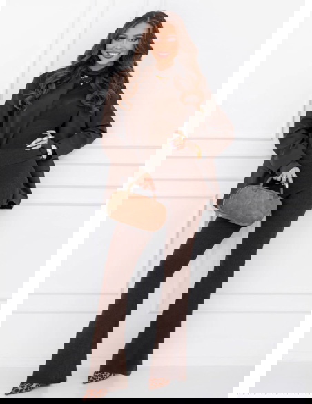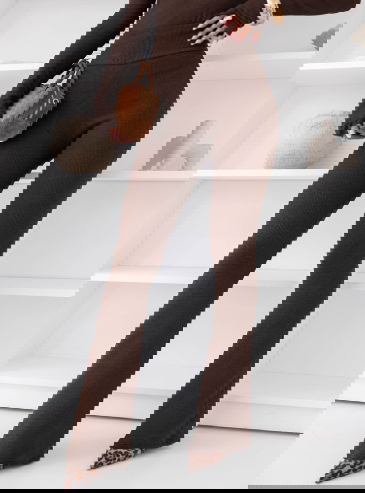 Wysoki stan sprawia, że spodnie dobrze układają się w okolicach bioder i brzucha. Elastyczna tkanina miękko dopasowuje się do ciała, dzięki czemu model sprawdzi się zarówno na co dzień, jak i w bardziej eleganckiej stylizacji. Głęboki czekoladowy odcień podkreśla ich wyrazistość i pięknie komponuje się z beżem, czernią oraz złotymi dodatkami.