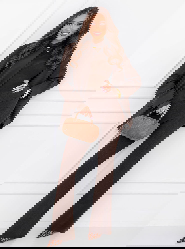 W wersji bardziej eleganckiej: z body, marynarką i szpilkami.