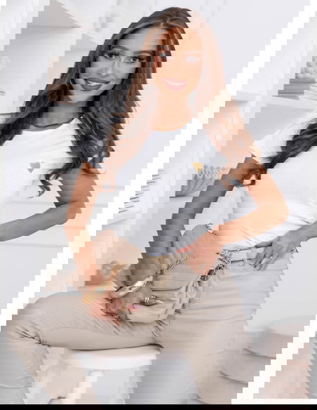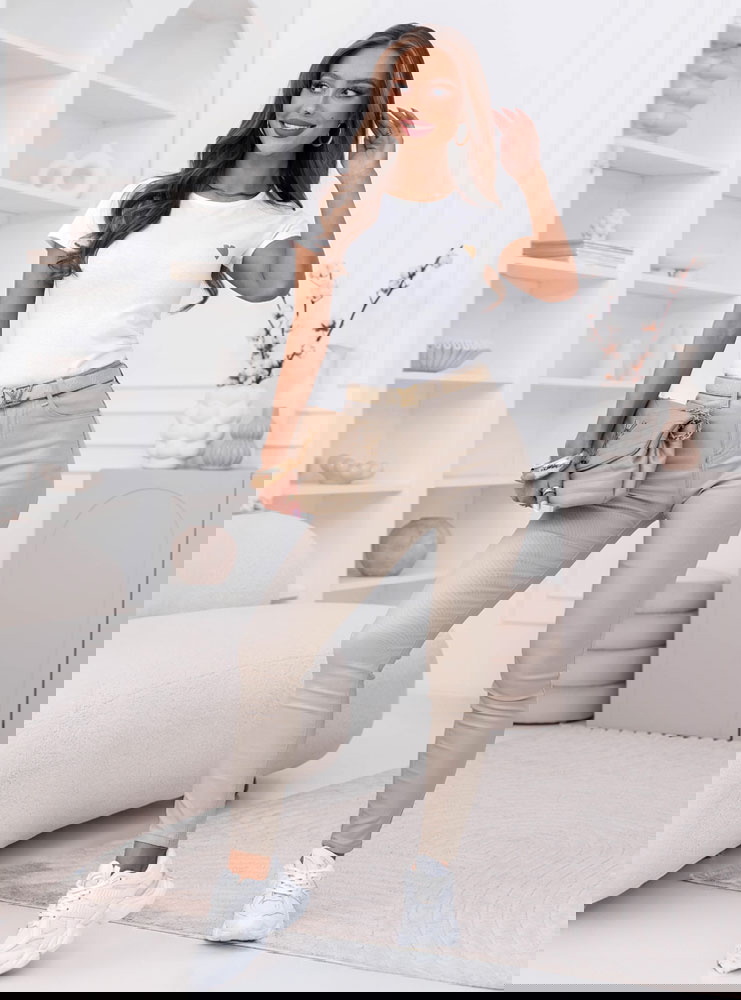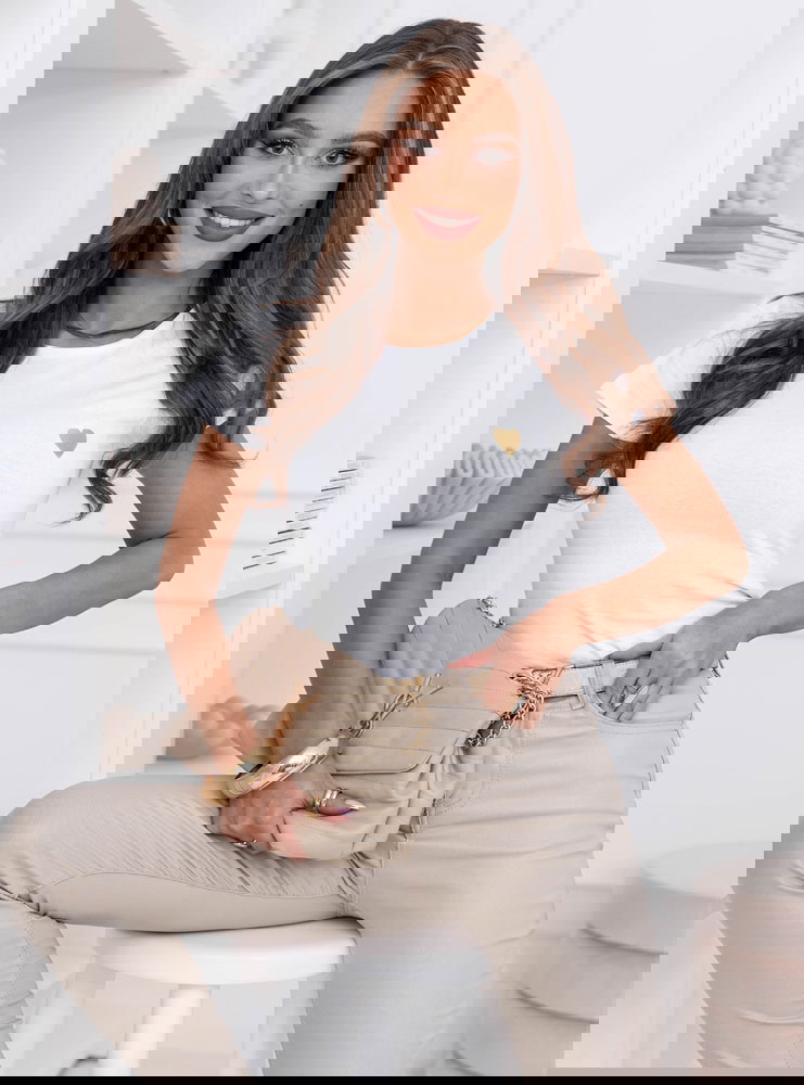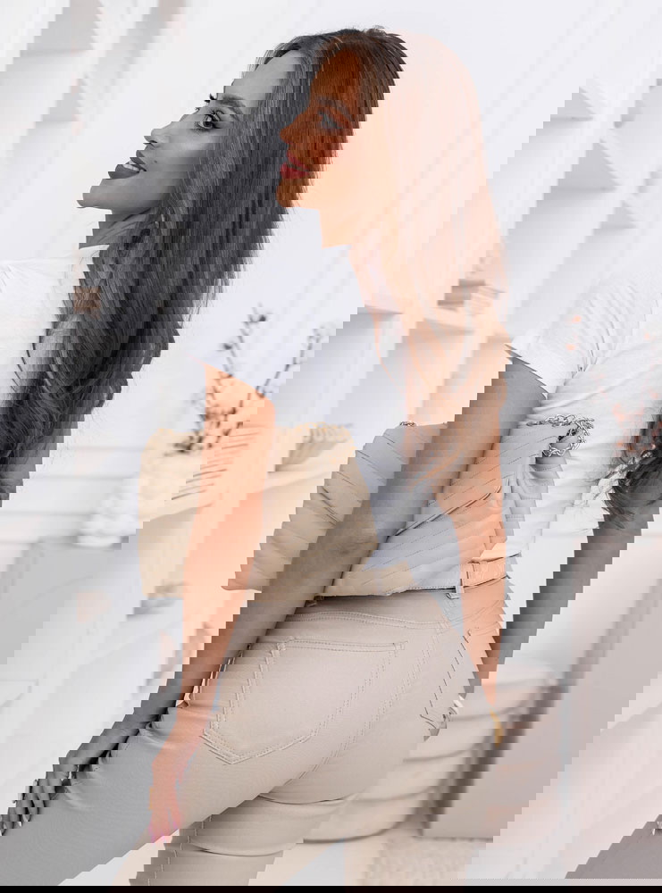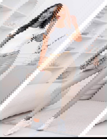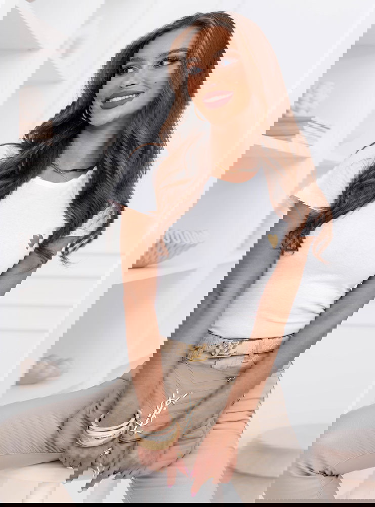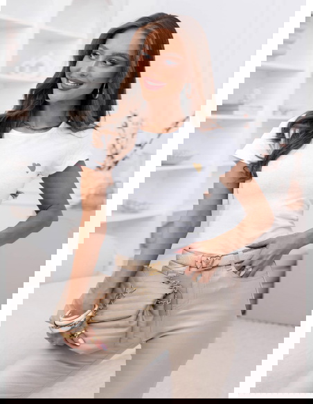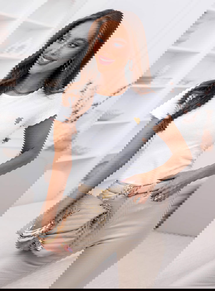 Biała koszulka na krótki rękaw z ozdobnym nadrukiem Jazmyn to klasyczny basic z delikatnym akcentem, który robi różnicę. Prosty, dopasowany fason podkreśla sylwetkę, a miękki materiał komfortowo układa się na ciele. Subtelne złote serduszko nadaje całości kobiecego charakteru i sprawia, że nawet najprostsza stylizacja wygląda bardziej dopracowanie. To model, który łączy minimalizm z lekką nutą romantyczną.