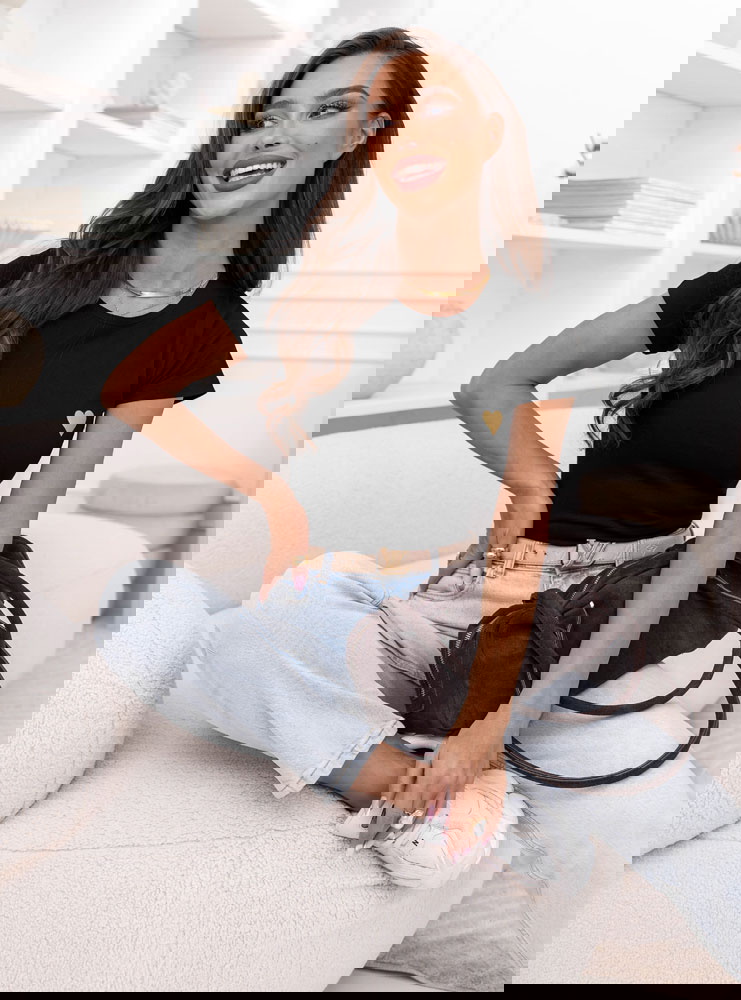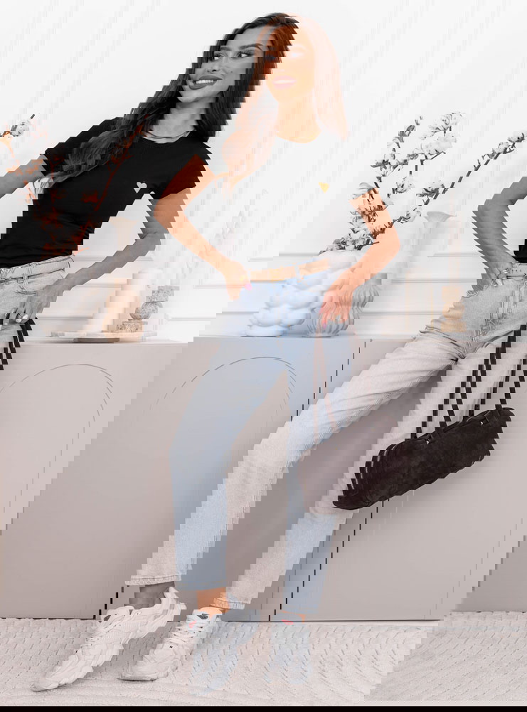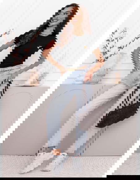 Czarna koszulka na krótki rękaw z ozdobnym nadrukiem Jazmyn to klasyka, która nigdy nie zawodzi. Dopasowany fason podkreśla sylwetkę, a gładka, elastyczna tkanina miękko układa się na ciele. Złote serduszko na wysokości klatki piersiowej dodaje subtelnego akcentu i przełamuje prostotę czerni. Całość wygląda czysto, kobieco i bardzo stylowo.