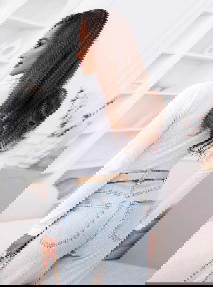 Na co dzień: z jasnymi jeansami i paskiem w talii.