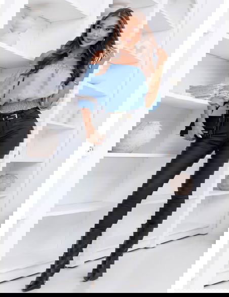 Materiał jest przewiewny i miękki, dzięki czemu bluzka sprawdzi się w cieplejsze dni. Możesz nosić ją luźno opuszczoną na ramiona albo lekko podciągniętą wyżej, w zależności od efektu, jaki chcesz uzyskać. To model, który przyciąga uwagę, ale nie jest przesadzony.