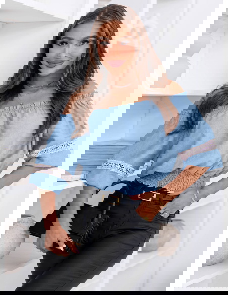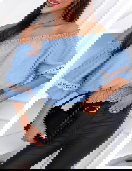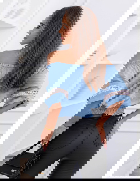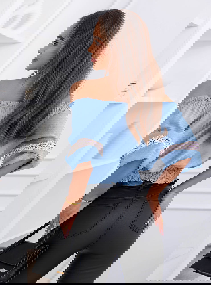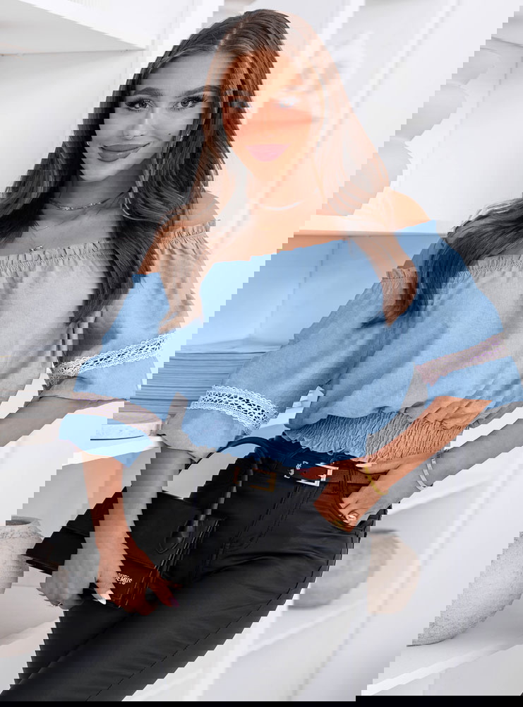 Błękitna bluzka typu hiszpanka Lawonaa to lekka, kobieca propozycja z odkrytymi ramionami i subtelnym wykończeniem. Elastyczna góra dobrze trzyma się na sylwetce, a marszczony dół podkreśla talię. Rękawy o długości 3/4 zakończone są delikatną koronką, która dodaje całości romantycznego charakteru. Błękitny kolor pięknie rozjaśnia twarz i pasuje zarówno do jasnych, jak i ciemnych dodatków.