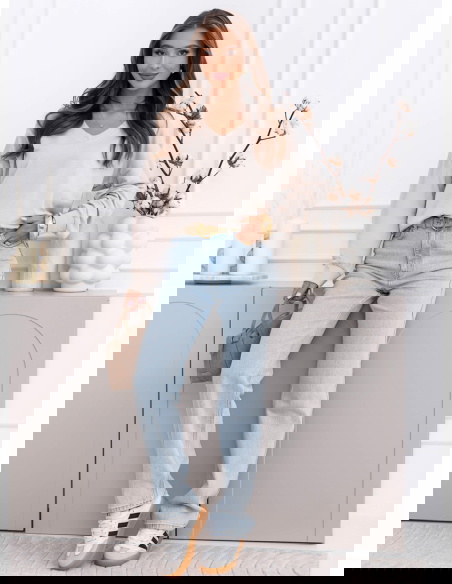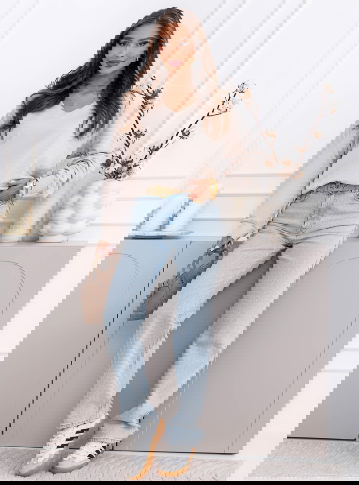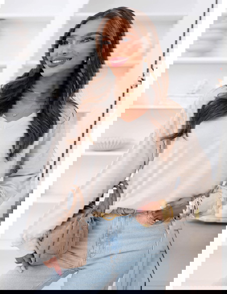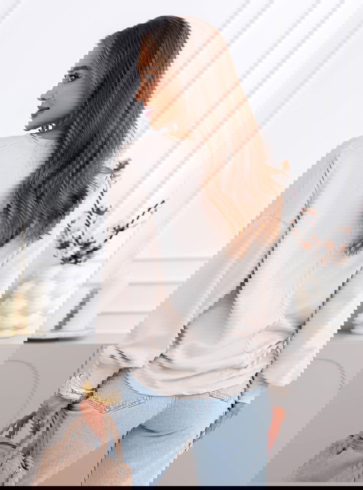 Beżowy odcień jest neutralny i bardzo łatwy do łączenia. Pasuje do jasnych jeansów, czarnych legginsów czy prążkowanych spodni. To model, który sprawdzi się przez cały rok, solo albo pod płaszcz czy kamizelkę.