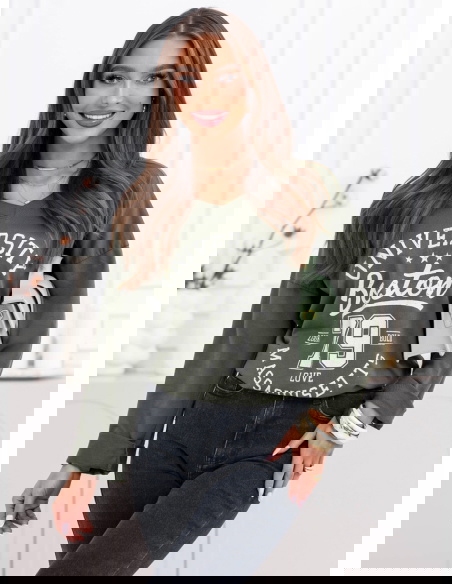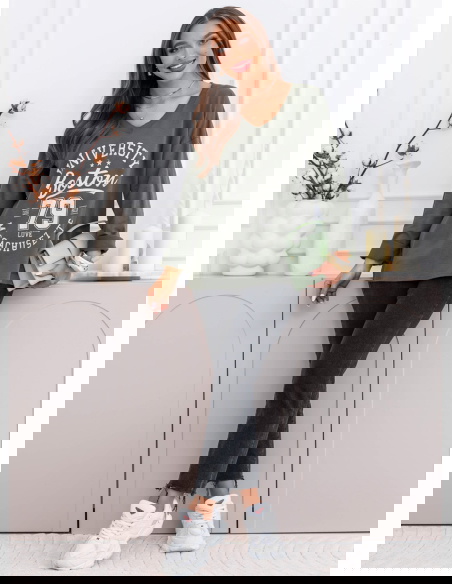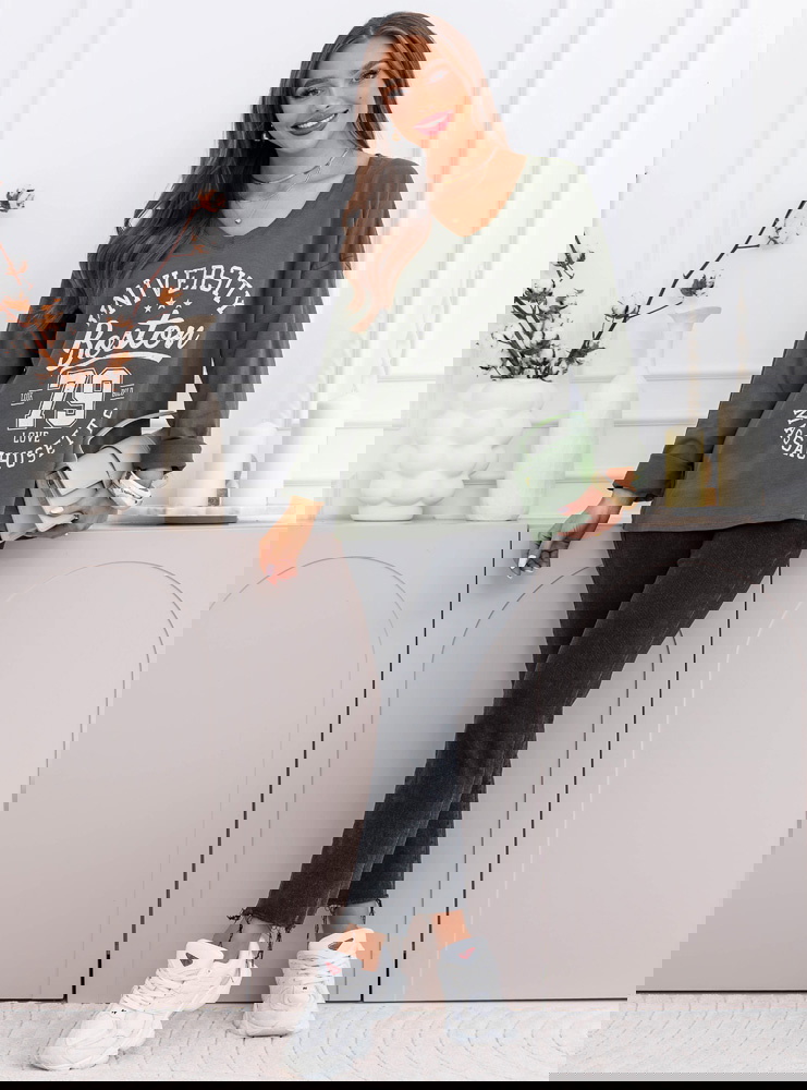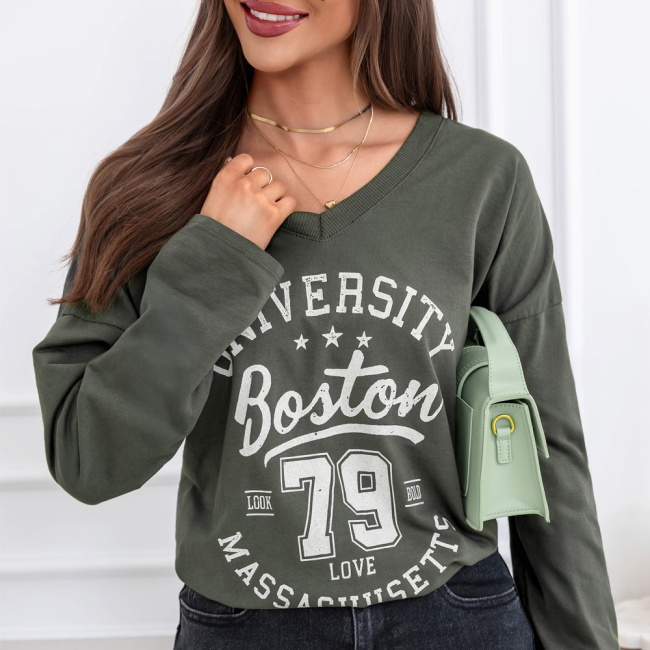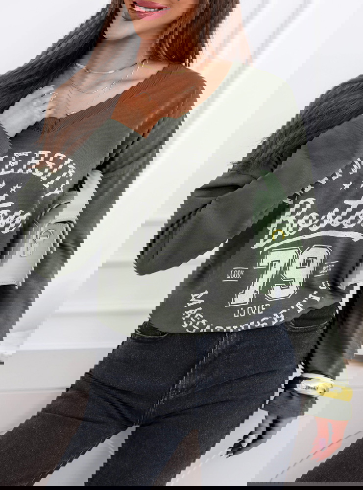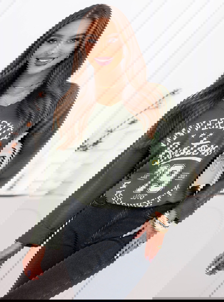 Bluzka z nadrukiem Samerra – khaki to luźna, wygodna propozycja w sportowym klimacie. Jasny nadruk w stylu college mocno odcina się od khaki i nadaje całości charakteru. Dekolt w serek delikatnie wysmukla górę sylwetki, a swobodny krój sprawia, że bluzka dobrze układa się na ciele i nie krępuje ruchów.
