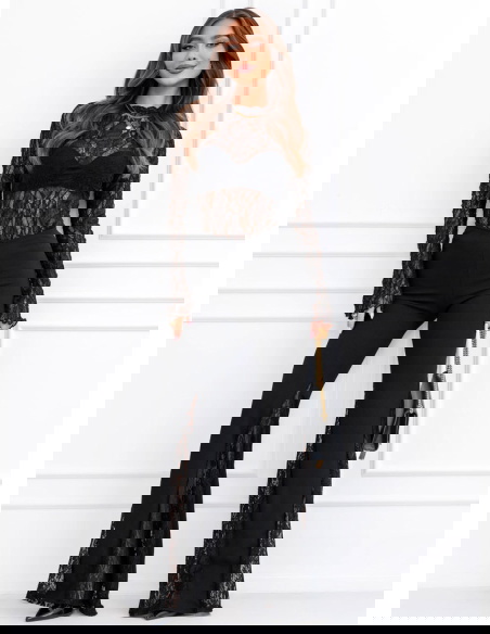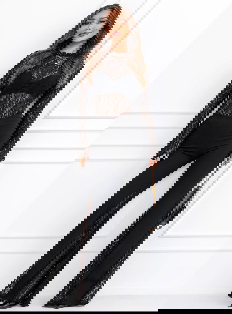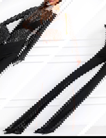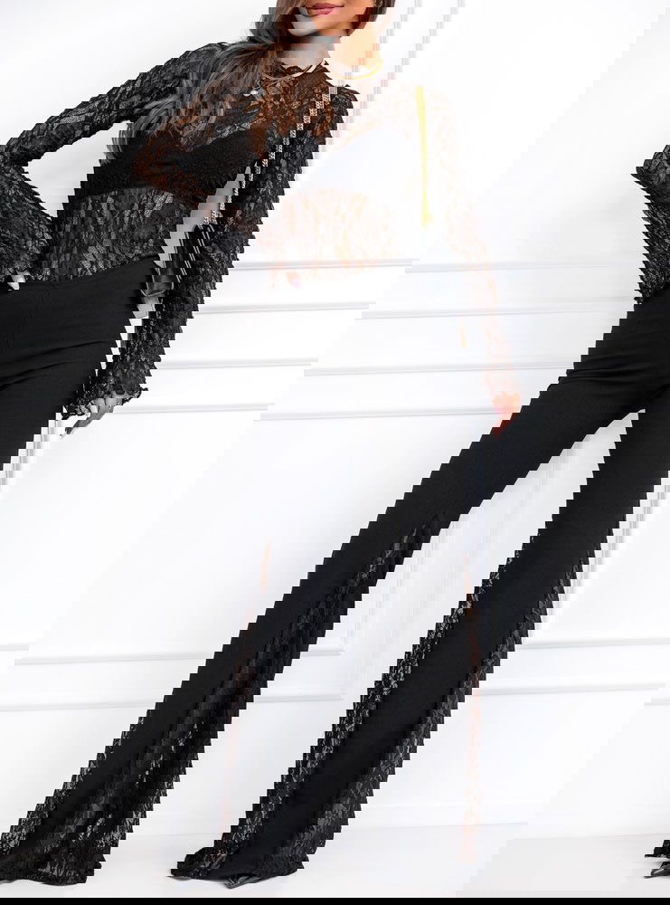 Rozszerzana nogawka optycznie wydłuża nogi i nadaje całości smukłego charakteru. Transparentna koronka subtelnie odsłania skórę, tworząc kobiecy, ale wyważony efekt. To fason, który robi wrażenie bez nadmiaru ozdobników.