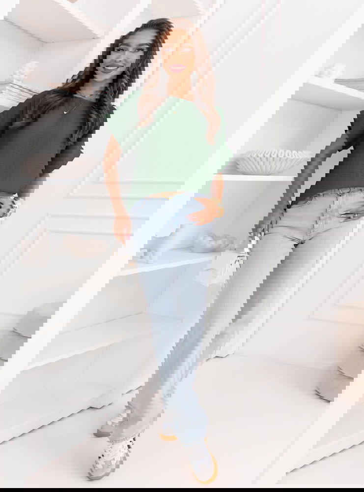 Na spotkanie – z dopasowanymi spodniami z wysokim stanem i sandałkami na obcasie. Stonowany kolor pozwala dobrać mocniejsze dodatki, jeśli chcesz nadać stylizacji wyrazistości.