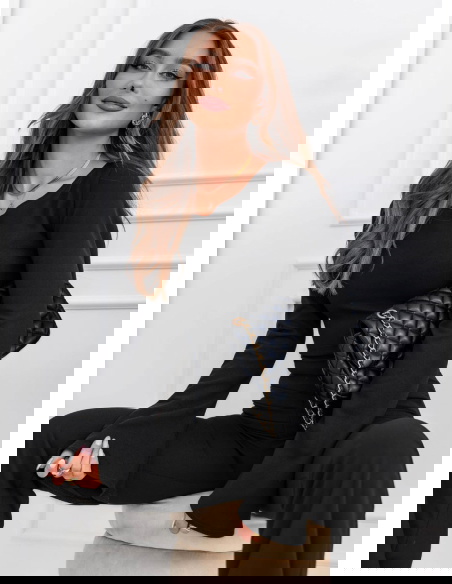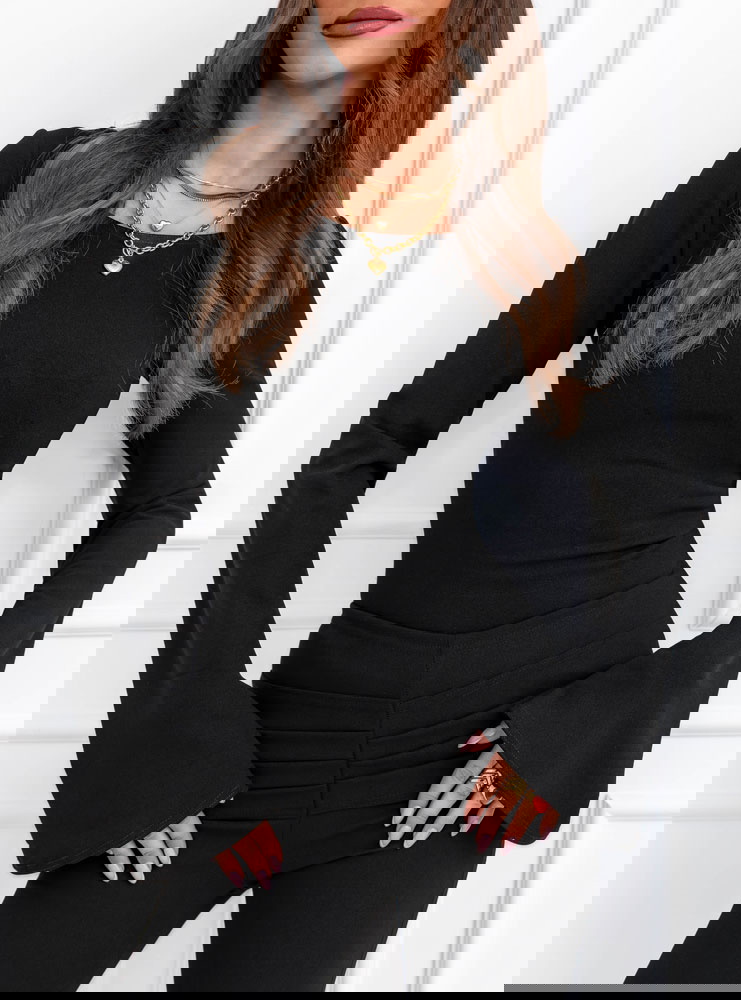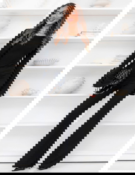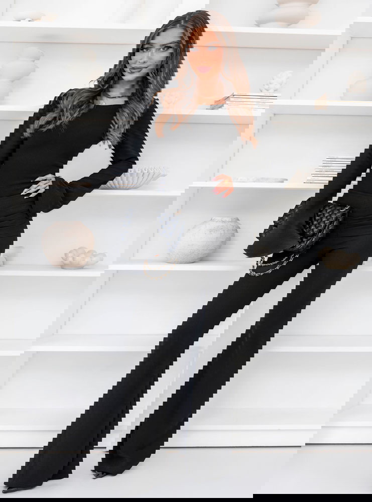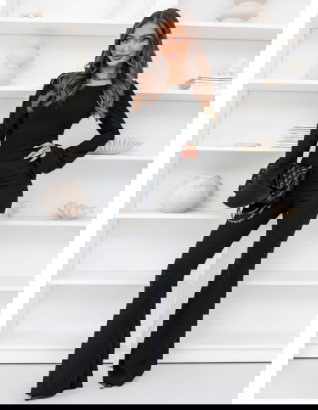 Czarny komplet bluzka i spodnie Emerette to dopasowany zestaw, który podkreśla sylwetkę i zachowuje elegancki, spójny charakter. Bluzka ma prosty dekolt i długie rękawy zakończone delikatnym rozszerzeniem, co nadaje całości lekkości. Spodnie z wysokim stanem dobrze układają się w talii i optycznie wydłużają nogi dzięki rozszerzanej nogawce. Gładki, czarny materiał wygląda klasycznie i pasuje do wielu dodatków. Całość tworzy wyraźną linię sylwetki i zachowuje proporcje.