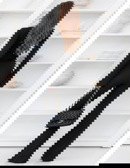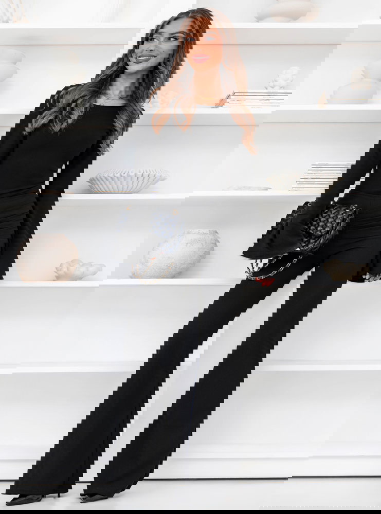 Wysoki stan podkreśla talię i stabilnie trzyma się na miejscu, a dopasowana góra akcentuje górną część sylwetki. Rozszerzane nogawki równoważą proporcje i wysmuklają nogi. Materiał jest elastyczny, dzięki czemu komplet dopasowuje się do ciała i zapewnia komfort noszenia przez cały dzień. Czerń jest ponadczasowa i łatwa do stylizowania, dlatego zestaw sprawdzi się w wielu sytuacjach.