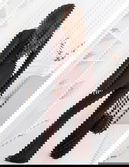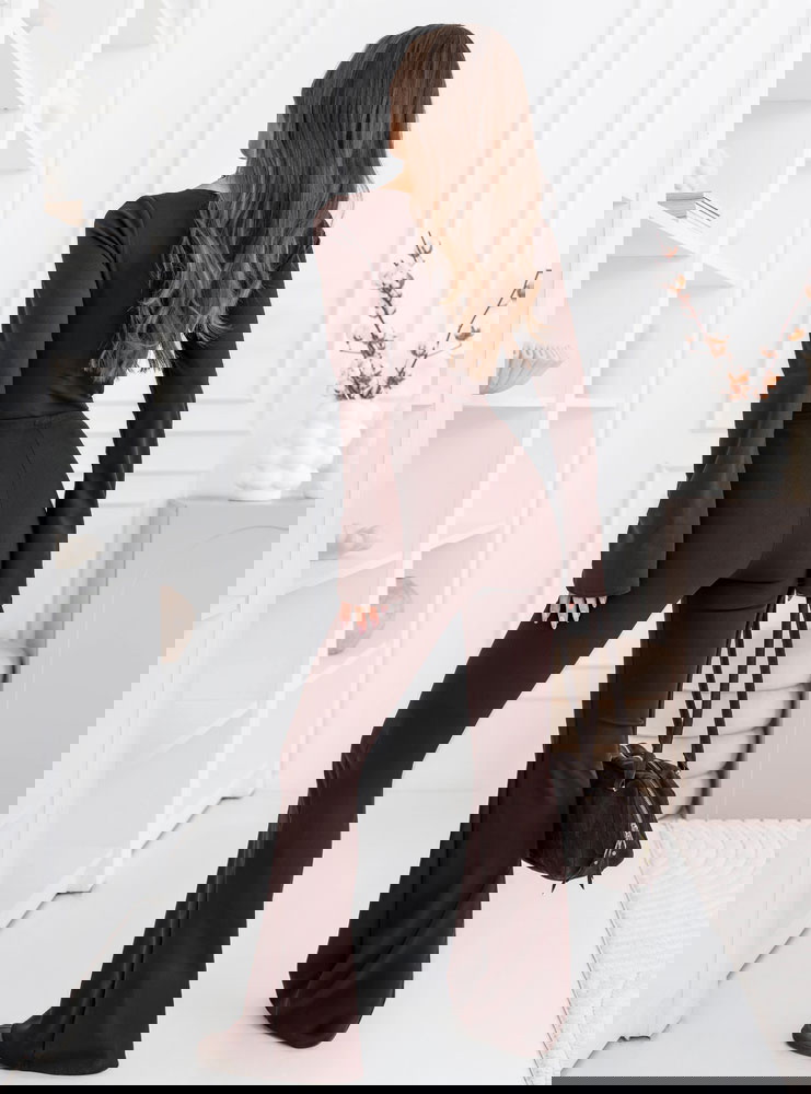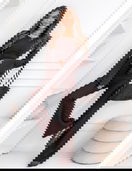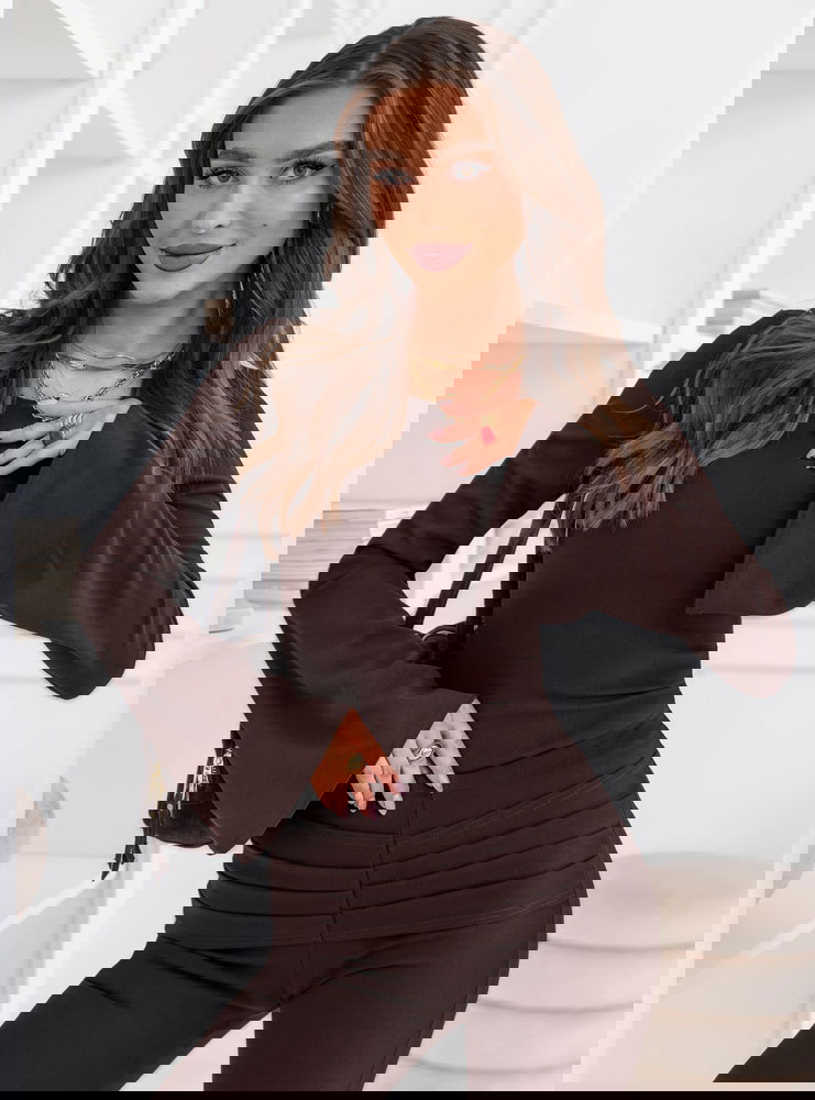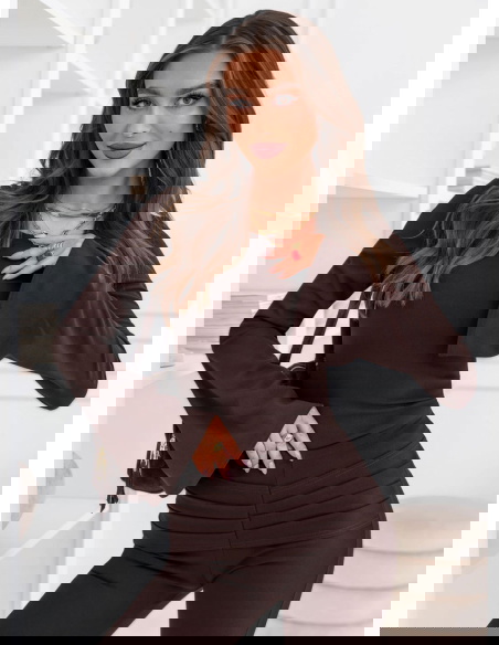 Czekoladowy komplet bluzka i spodnie Emerette to dopasowany zestaw w głębokim, ciepłym odcieniu brązu, który podkreśla sylwetkę i nadaje jej wyrazisty charakter. Bluzka ma prosty dekolt oraz długie, rozszerzane rękawy, które dodają lekkości i subtelnej elegancji. Spodnie z wysokim stanem dobrze układają się w talii i modelują jej linię. Rozszerzane nogawki optycznie wydłużają nogi i równoważą proporcje. Gładki materiał tworzy spójną, estetyczną całość.