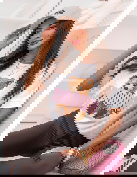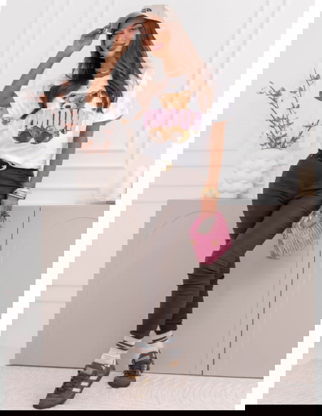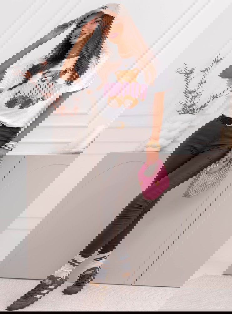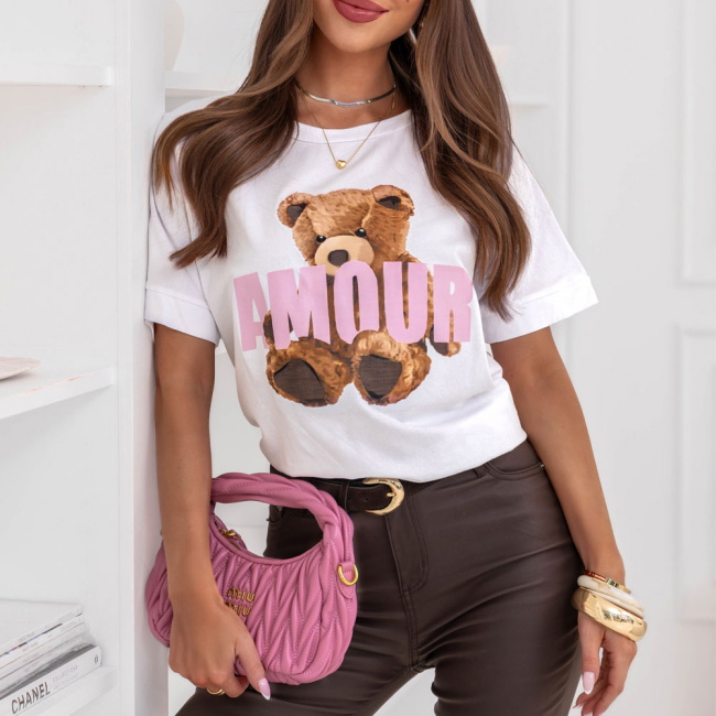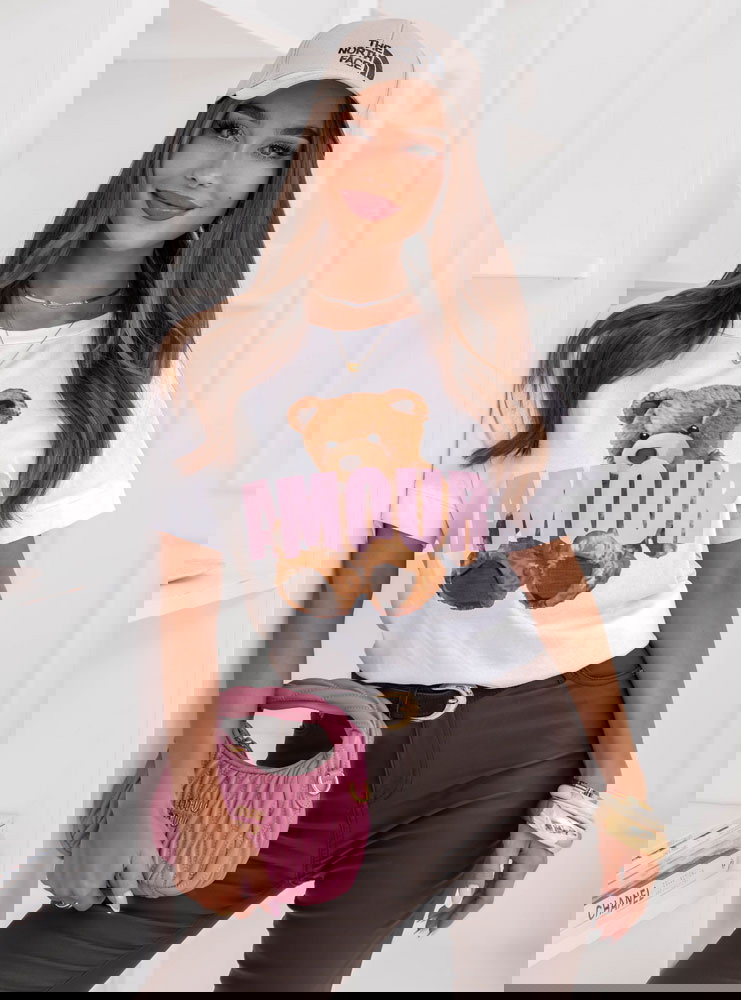 Biała bluzka z ozdobnym nadrukiem Jimmia to swobodny model z wyrazistym motywem, który przełamuje klasyczną formę T-shirtu. Luźniejszy krój zapewnia wygodę i dobrze układa się na sylwetce, nie opinając jej nadmiernie. Okrągły dekolt i krótkie rękawy nadają jej codzienny, uniwersalny charakter. Kontrastowy nadruk z motywem misia i napisem przyciąga uwagę i nadaje stylizacji lekkości. Biel stanowi jasną bazę, która rozświetla całość.