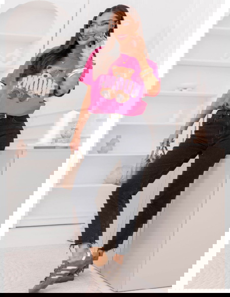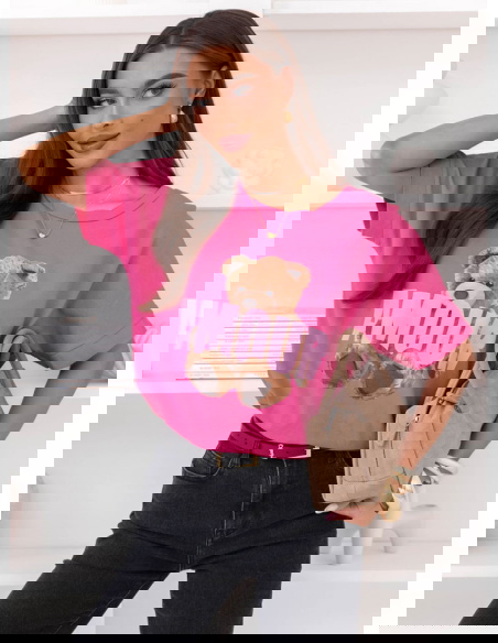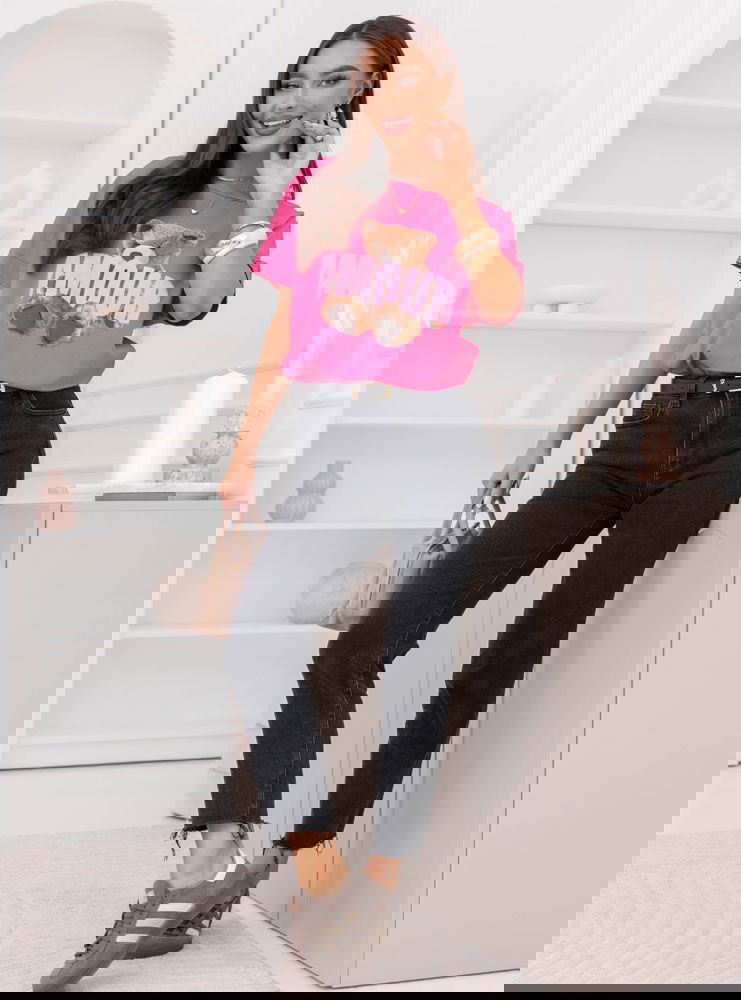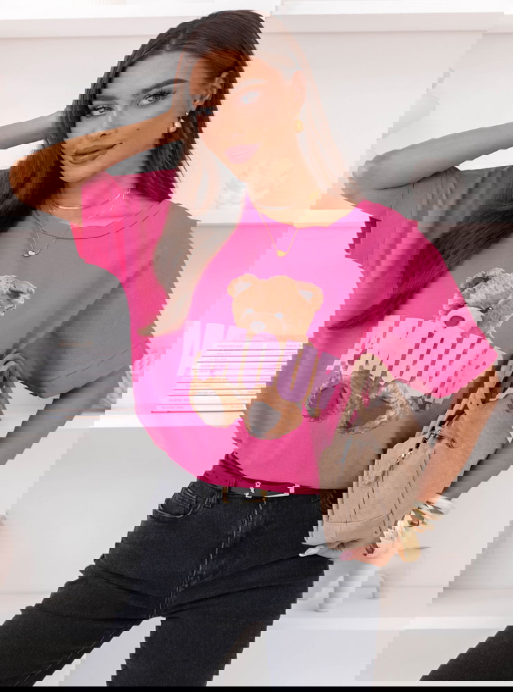Bluzka z ozdobnym nadrukiem Jimmia – fuksja to wyrazisty model, który od razu przyciąga uwagę kolorem. Luźniejszy krój zapewnia swobodę i dobrze układa się na sylwetce, tworząc niezobowiązujący, codzienny efekt. Klasyczny, okrągły dekolt i krótkie rękawy nadają jej uniwersalny charakter. Kontrastowy nadruk z motywem misia i napisem przełamuje intensywną barwę i nadaje całości modowego akcentu. Fuksja ożywia stylizację i dodaje jej energii.