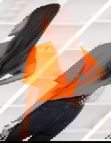 Miękki materiał sprawia, że bluzka jest wygodna w noszeniu przez cały dzień. Luźniejsza forma pozwala stylizować ją na różne sposoby – włożoną w spodnie lub noszoną swobodnie. Pomarańczowy kolor dobrze kontrastuje z czernią, denimem czy beżowymi dodatkami, tworząc wyraziste, ale spójne zestawienia. To propozycja dla osób, które lubią kolor w bardziej zdecydowanym wydaniu.