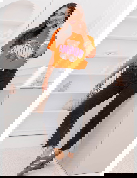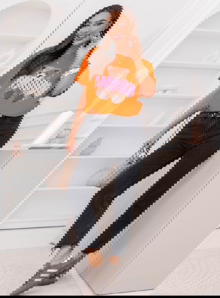 Pomarańczowa bluzka z ozdobnym nadrukiem Jimmia to model, który od razu przyciąga uwagę intensywnym kolorem. Swobodny krój zapewnia komfort i dobrze układa się na sylwetce, nie opinając jej nadmiernie. Klasyczny, okrągły dekolt oraz krótkie rękawy nadają jej uniwersalny, codzienny charakter. Duży nadruk z motywem misia i napisem przełamuje mocny odcień i nadaje całości lekkości. To T-shirt, który ożywia nawet najprostszą stylizację.