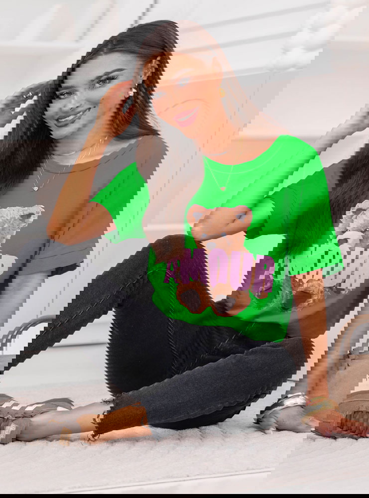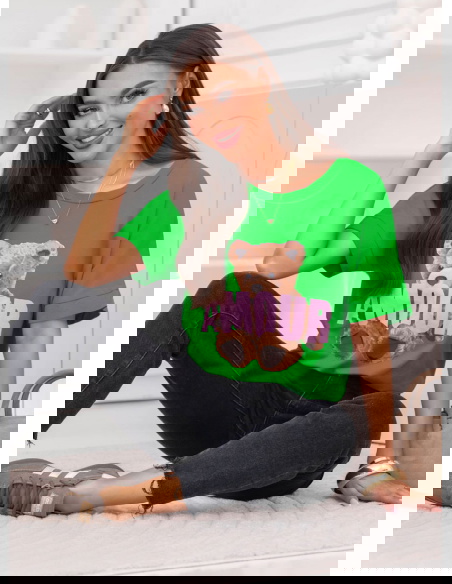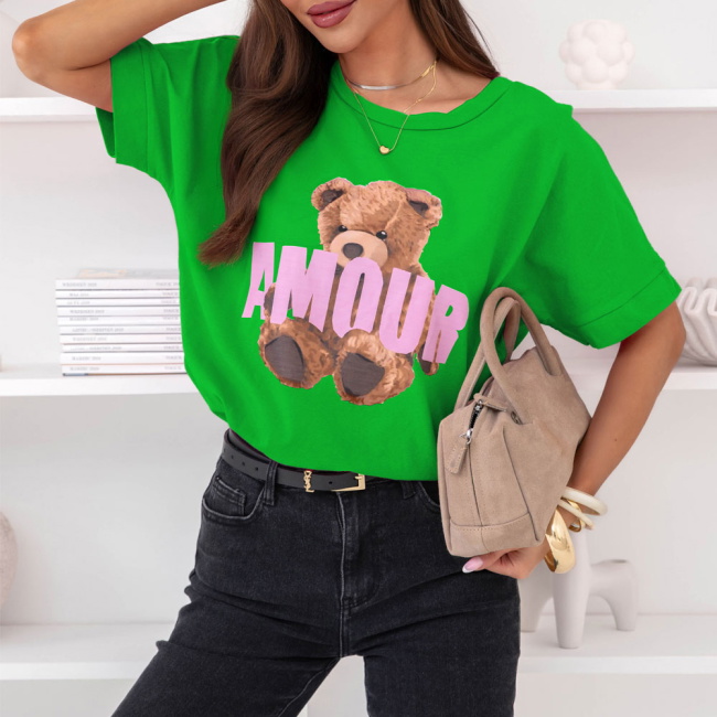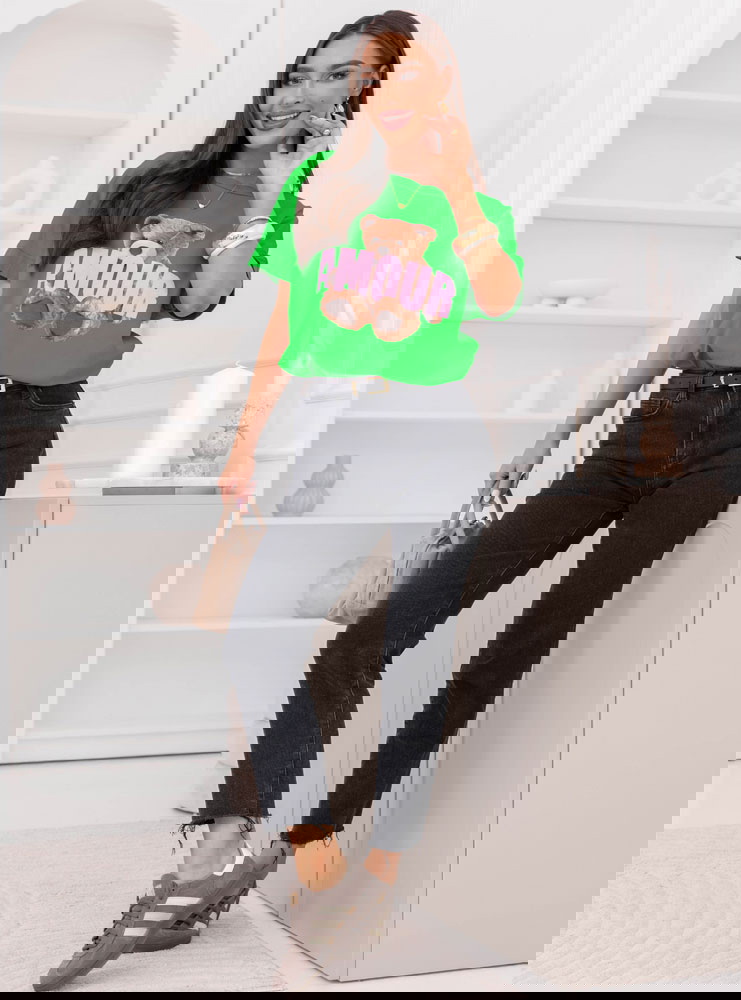 Zielona bluzka z ozdobnym nadrukiem Jimmia to model w intensywnym, nasyconym odcieniu, który od razu nadaje stylizacji świeżości. Luźny fason swobodnie układa się na sylwetce i zapewnia komfort noszenia na co dzień. Klasyczny, okrągły dekolt oraz krótkie rękawy sprawiają, że to uniwersalny T-shirt o casualowym charakterze. Duży nadruk z motywem misia i napisem stanowi wyraźny akcent i przełamuje moc koloru. Całość wygląda nowocześnie i lekko.