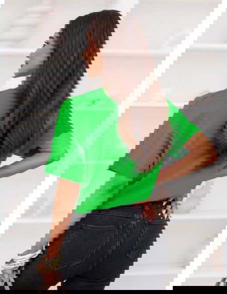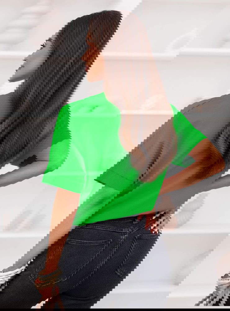 Miękka tkanina jest przyjemna w dotyku i dobrze sprawdza się w codziennym użytkowaniu. Swobodna forma pozwala nosić bluzkę zarówno luźno, jak i częściowo wpuszczoną w spodnie. Zielony odcień ciekawie kontrastuje z czernią, jasnym denimem czy beżowymi dodatkami. To propozycja, która sprawdzi się w miejskich, mniej formalnych stylizacjach.