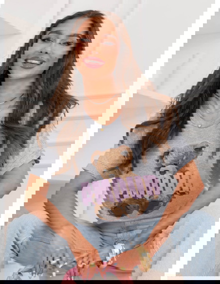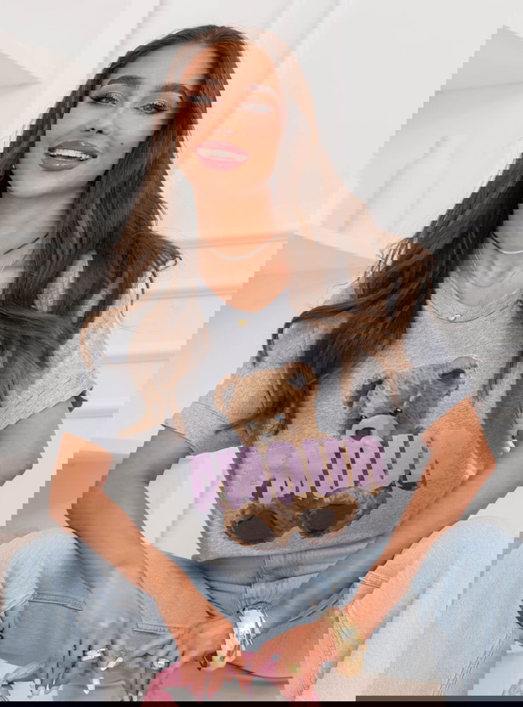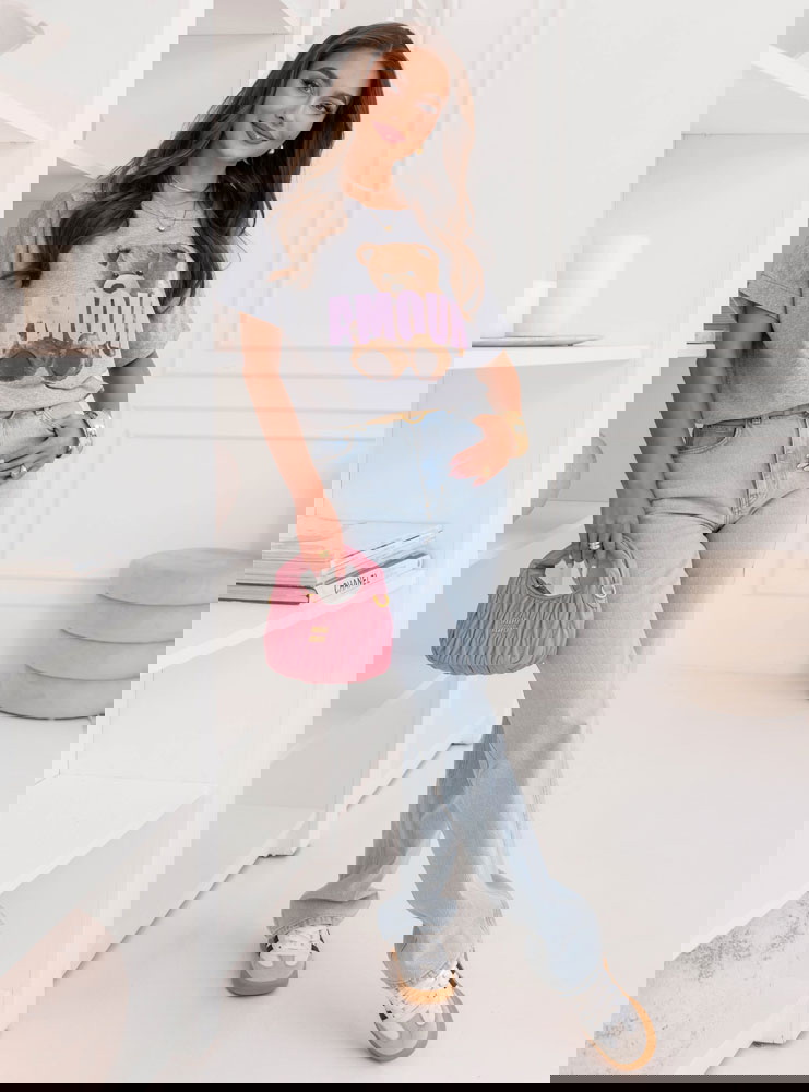 Szara bluzka z ozdobnym nadrukiem Jimmia to swobodny model w neutralnym odcieniu, który stanowi dobrą bazę do codziennych stylizacji. Luźniejszy krój zapewnia komfort i naturalnie układa się na sylwetce. Okrągły dekolt oraz krótkie rękawy podkreślają jej casualowy charakter. Kontrastowy nadruk z motywem misia i napisem nadaje całości wyrazistości i przełamuje prostotę szarości. To T-shirt, który łączy wygodę z modnym detalem.