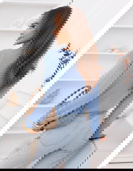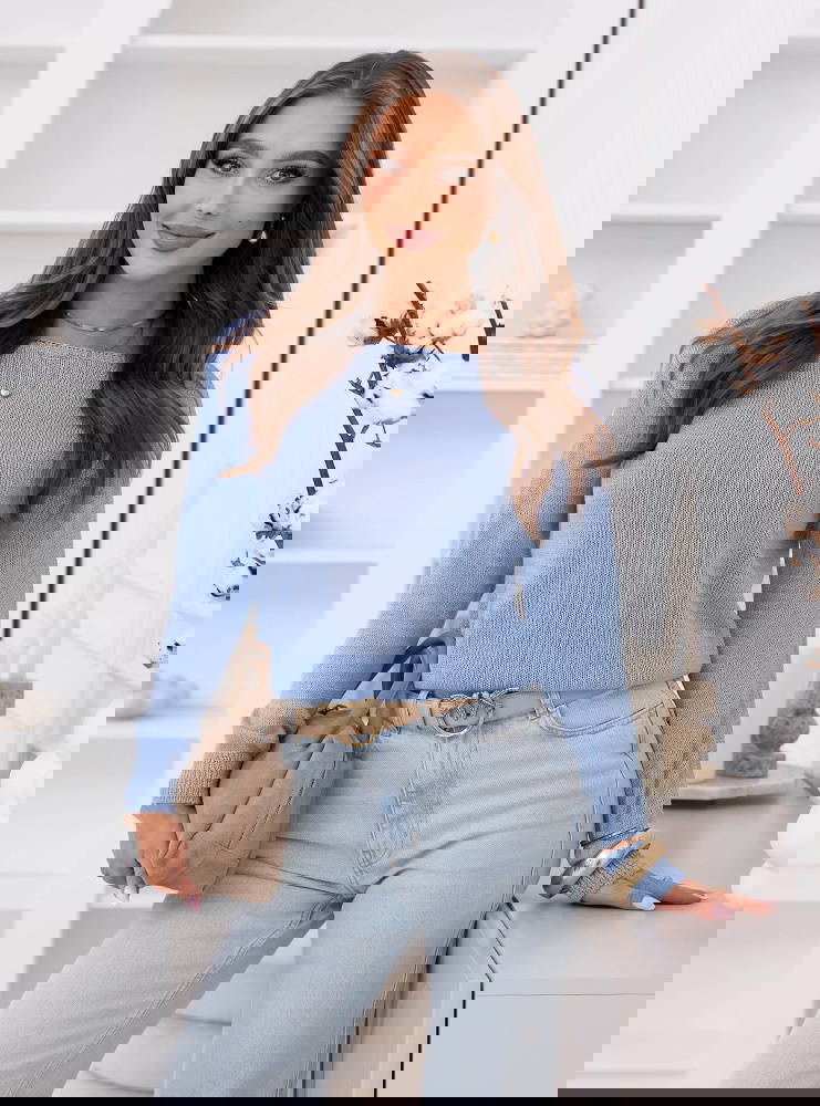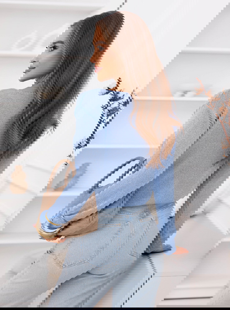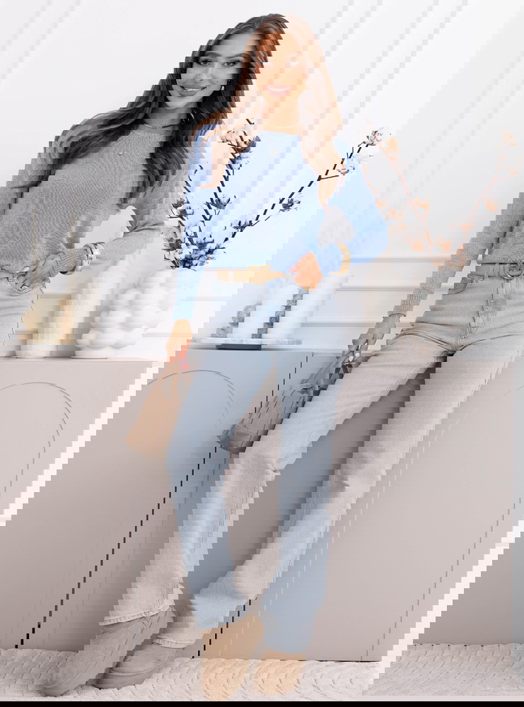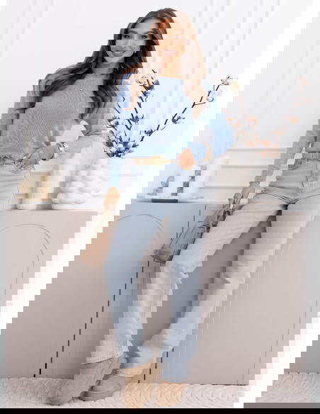 Dzianina jest miękka i przyjemna w dotyku. Model sprawdzi się zarówno noszony samodzielnie, jak i pod marynarką czy lekkim płaszczem. Jasny kolor dobrze łączy się z denimem, beżem, bielą czy szarością, tworząc spójne zestawienia. To sweter, który łatwo dopasować do różnych stylów.