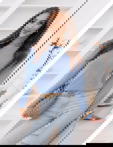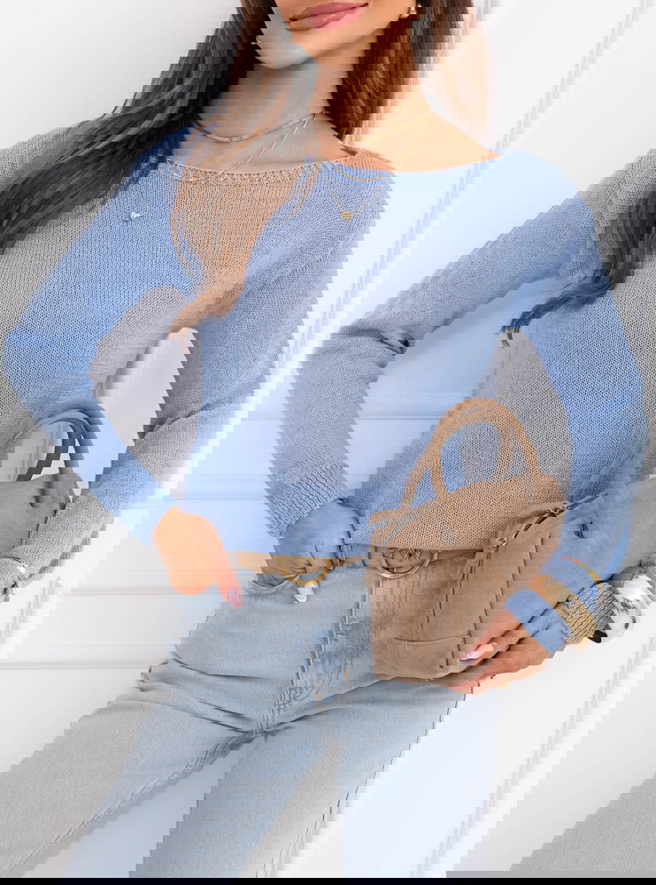 Błękitny sweter z dekoltem w łódkę Itsaso to lekki model w jasnym, świeżym odcieniu, który nadaje stylizacji subtelności. Dekolt w łódkę delikatnie odsłania linię obojczyków i optycznie poszerza górną część sylwetki. Fason jest prosty, z lekkim dopasowaniem, dzięki czemu sweter dobrze układa się na ciele i nie zaburza proporcji. Długie rękawy zakończone ściągaczem utrzymują formę i zapewniają wygodę w codziennym noszeniu. Błękit rozjaśnia całość i wprowadza spokojny, harmonijny akcent.