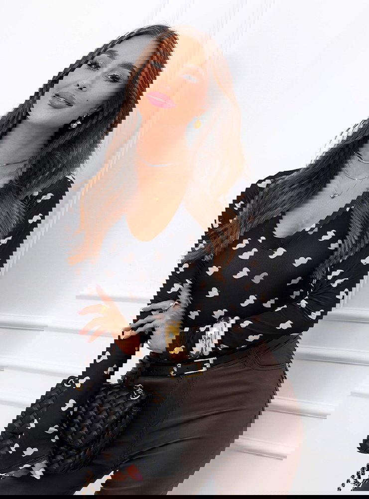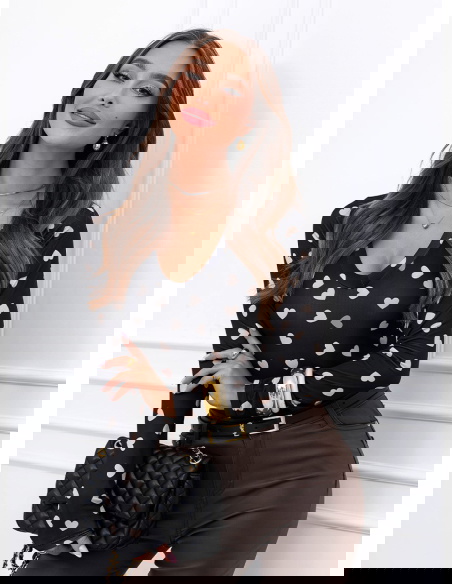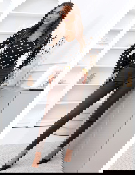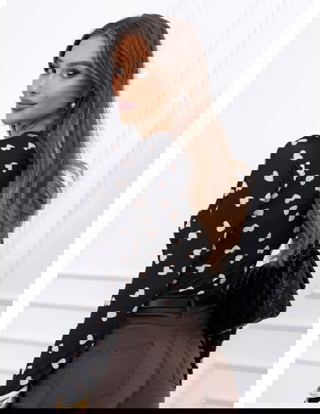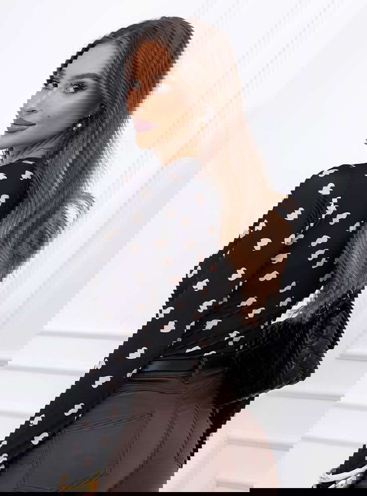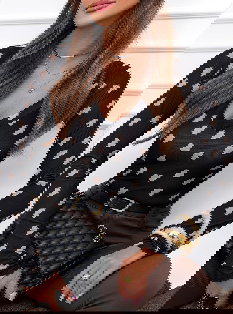 Bluzka w serduszka i dekoltem w serek Landrada – wzór 2 to bardziej zmysłowa odsłona romantycznego motywu. Czarne tło w połączeniu z jasnymi serduszkami wygląda elegancko i wyraziście. Dekolt w serek ładnie podkreśla linię biustu i wydłuża szyję, a dopasowany fason akcentuje talię. Długie rękawy sprawiają, że model świetnie sprawdzi się także w chłodniejsze dni.