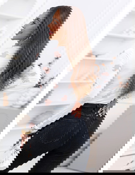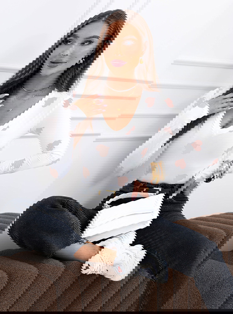 Beżowa bluzka w serduszka i dekoltem w serek Landrada to delikatniejsza, bardziej subtelna wersja romantycznego motywu. Jasna baza i beżowe serduszka tworzą spójne, lekkie połączenie, które wygląda świeżo i kobieco. Dekolt w serek ładnie podkreśla obojczyki i wysmukla górną część sylwetki, a dopasowany krój podkreśla talię bez przesadnego opinania.