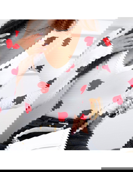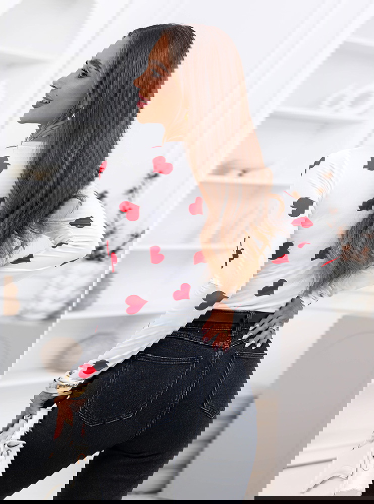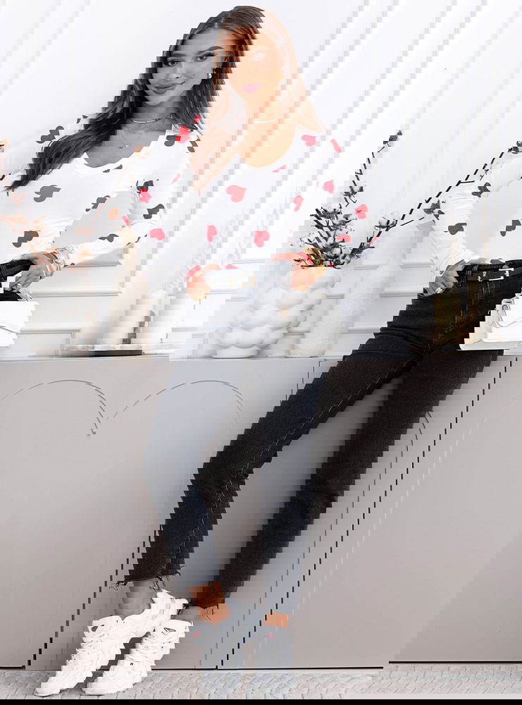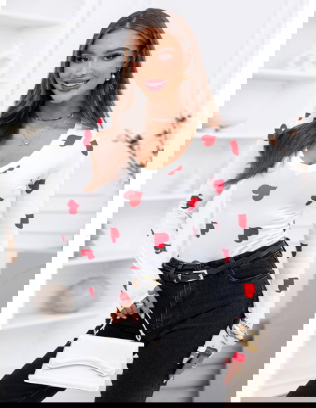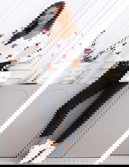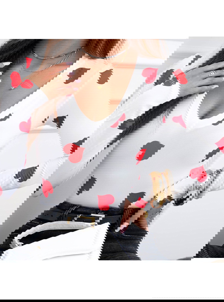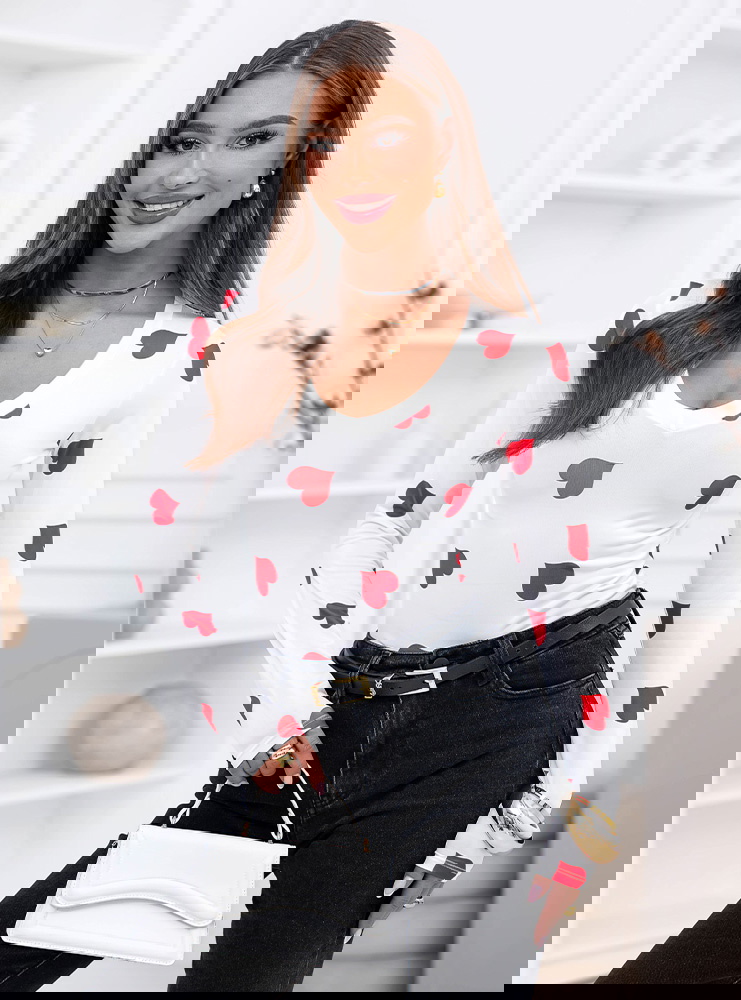 Malinowa bluzka w serduszka i dekoltem w serek Landrada to najbardziej wyrazista wersja tego modelu. Kontrast białej bazy i intensywnie malinowych serduszek od razu przyciąga wzrok. Dekolt w serek podkreśla kobiecą linię szyi, a dopasowany fason ładnie akcentuje talię i nadaje sylwetce smukłości.