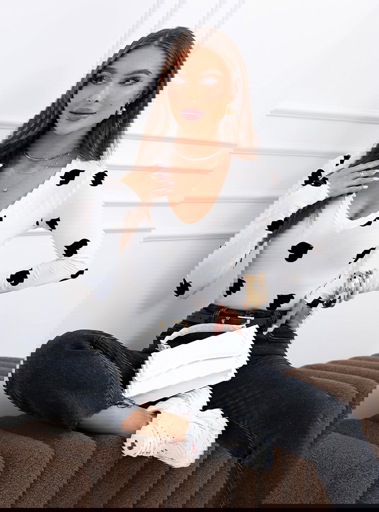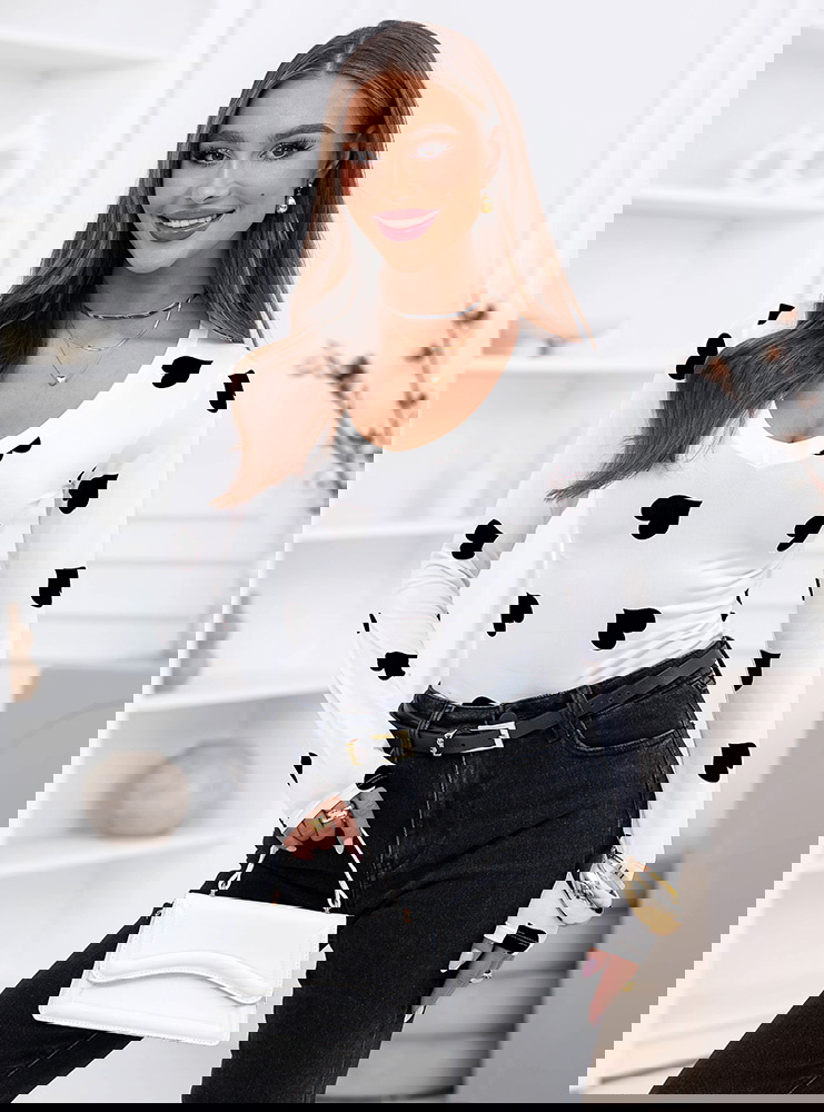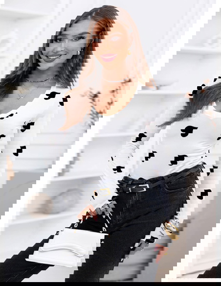 Czarna bluzka w serduszka i dekoltem w serek Landrada to kontrastowa, wyrazista wersja tego modelu. Jasna baza przełamana czarnymi serduszkami wygląda nowocześnie i mocniej niż pastelowe odsłony. Dekolt w serek podkreśla linię biustu i optycznie wydłuża szyję, a dopasowany fason akcentuje talię i nadaje sylwetce wyraźnych proporcji.
