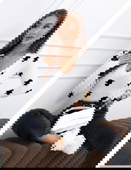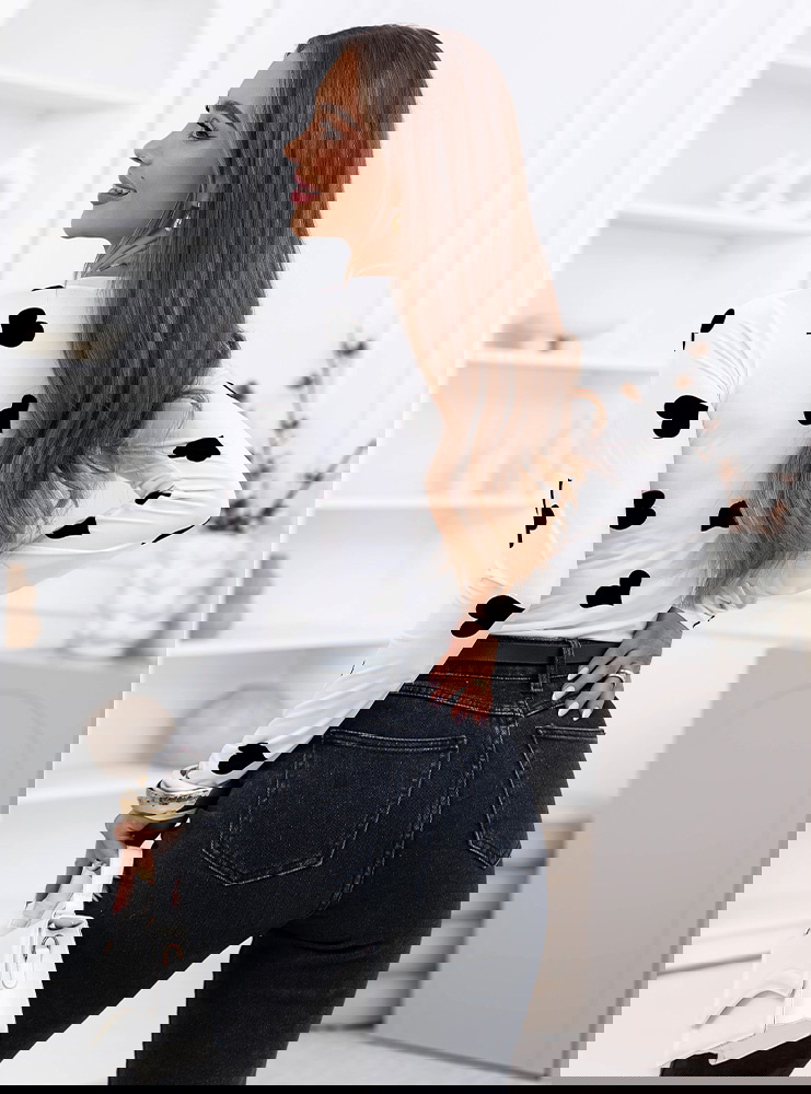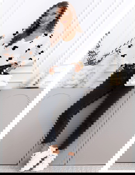 To propozycja dla kobiet, które lubią połączenie romantycznego motywu z bardziej zdecydowanym charakterem. Wzór przyciąga uwagę, ale całość nadal pozostaje elegancka i łatwa do zestawienia z klasycznymi elementami garderoby. Bluzka dobrze układa się na ciele i świetnie prezentuje się włożona w spodnie z wysokim stanem.