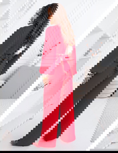 alinowy kombinezon wiązany w talii Neighlee to elegancki model o kobiecym, dopracowanym kroju. Kopertowy dekolt subtelnie podkreśla linię szyi i optycznie wysmukla górną część sylwetki. Wiązanie w talii pozwala precyzyjnie dopasować fason i wyraźnie zaznaczyć proporcje. Szerokie nogawki swobodnie opadają, wydłużają nogi i nadają całości lekkości. Materiał miękko układa się na ciele, nie krępuje ruchów i zapewnia komfort noszenia. Malinowy kolor jest intensywny, ale elegancki, dlatego sprawdzi się zarówno na większe wyjścia, jak i w bardziej stonowanych stylizacjach.