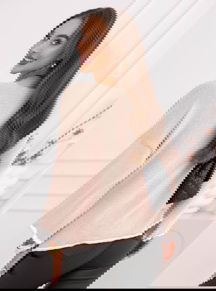Neutralny kolor i dekoracyjny detal sprawiają, że to sweter, który łatwo dopasować, a trudno przeoczyć.