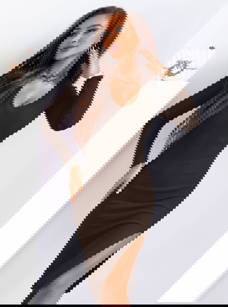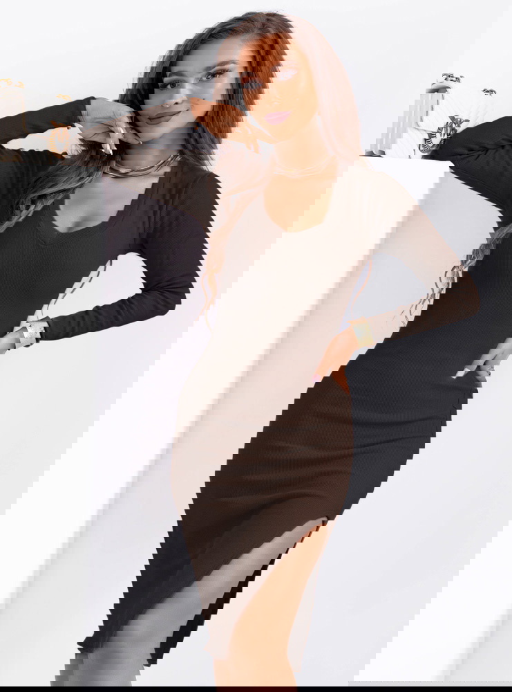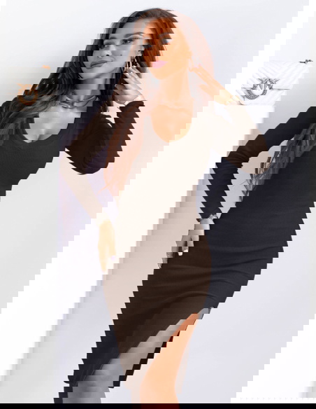 Czekoladowa prążkowana dopasowana sukienka z dekoltem w serek Nazioo to model, który podkreśla sylwetkę i nadaje jej wyraźnych proporcji. Dopasowany krój przylega do ciała, akcentując talię i linię bioder. Dekolt w serek optycznie wydłuża szyję i równoważy całość. Długie rękawy nadają jej bardziej stonowanego charakteru, a rozcięcie na nodze dodaje lekkości i kobiecego akcentu. Prążkowana dzianina wysmukla sylwetkę i dobrze dopasowuje się do ruchu. Głęboki czekoladowy kolor wygląda elegancko i sprawia, że sukienka prezentuje się nowocześnie.