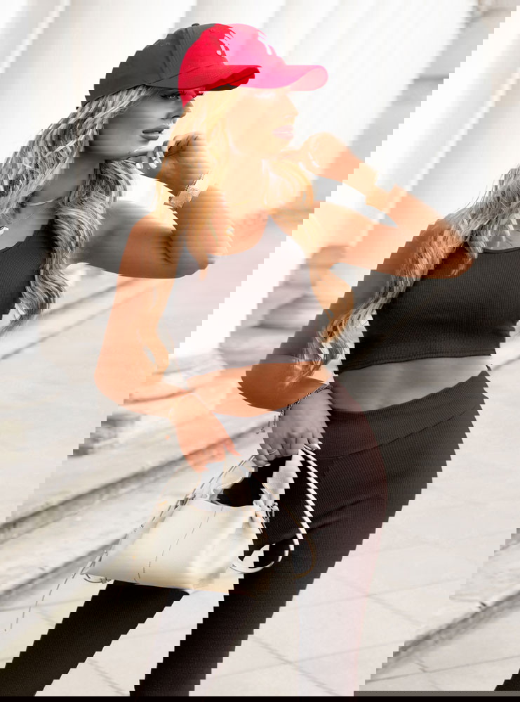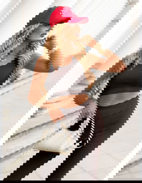 Czekoladowy prążkowany komplet top i legginsy Bonella to dopasowany zestaw o sportowo-miejskim charakterze. Krótki top na ramiączkach podkreśla linię ramion i dobrze przylega do sylwetki. Legginsy z wysokim stanem stabilnie trzymają się w talii i modelują proporcje. Prążkowana dzianina optycznie wysmukla oraz nadaje całości uporządkowanego wyglądu. Materiał jest elastyczny, miękki i komfortowy w noszeniu, dlatego komplet sprawdzi się zarówno w ruchu, jak i podczas codziennych aktywności. Głęboki czekoladowy kolor wygląda nowocześnie i dobrze łączy się z beżem, bielą oraz złotymi dodatkami.