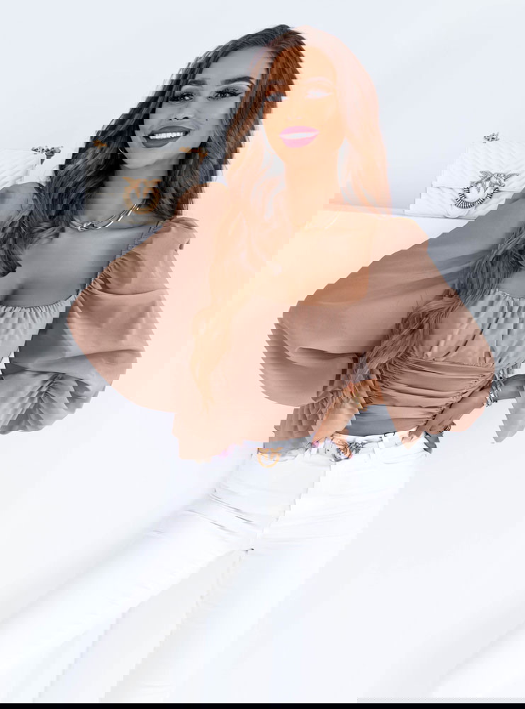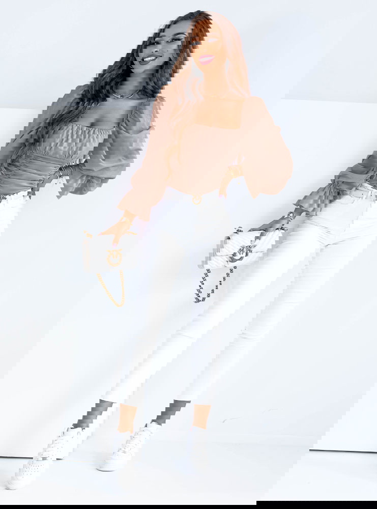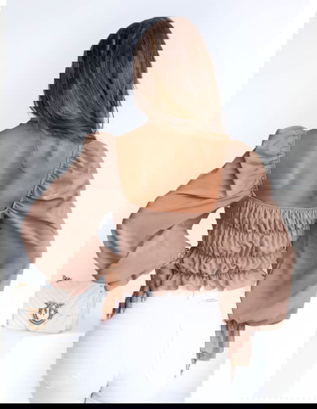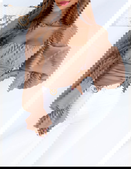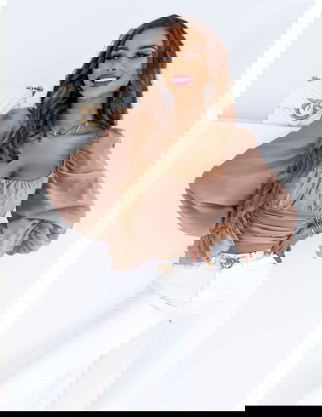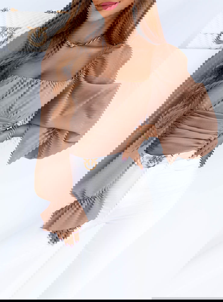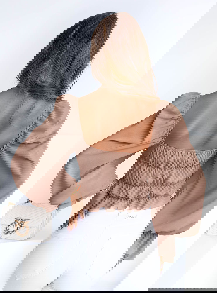 Szyfonowa bluzka typu hiszpanka Sellenies - mocha mousse to elegancki model o dopracowanej, kobiecej linii. Kwadratowy dekolt podkreśla obojczyki i nadaje stylizacji subtelnej wyrazistości. Dopasowana talia z marszczeniami modeluje sylwetkę i ładnie akcentuje jej proporcje. Długie, bufiaste rękawy wprowadzają lekkość i równoważą przylegającą górę. Szyfonowy materiał miękko układa się na ciele i jest komfortowy w noszeniu. Odcień mocha mousse to ciepły, stonowany kolor, który dobrze komponuje się z bielą, beżem i złotymi dodatkami.