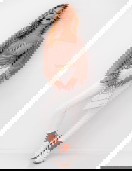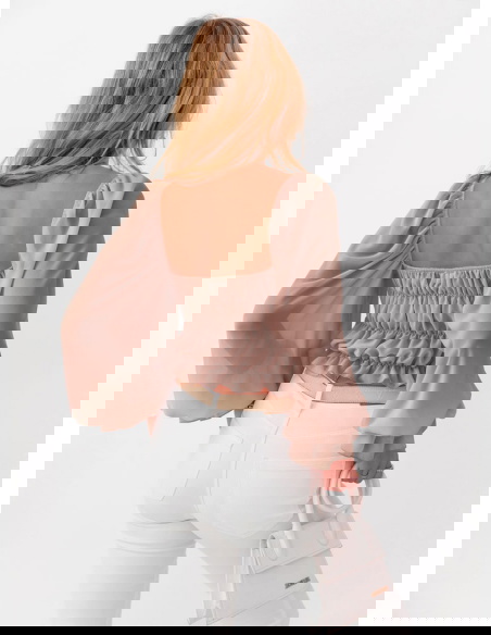 To fason, który przyciąga uwagę detalem i krojem, a jednocześnie pozostaje subtelny. Elastyczne marszczenie z tyłu sprawia, że bluzka dobrze dopasowuje się do sylwetki. Świetnie sprawdzi się w stylizacjach, w których chcesz zachować równowagę między elegancją a kobiecością.
