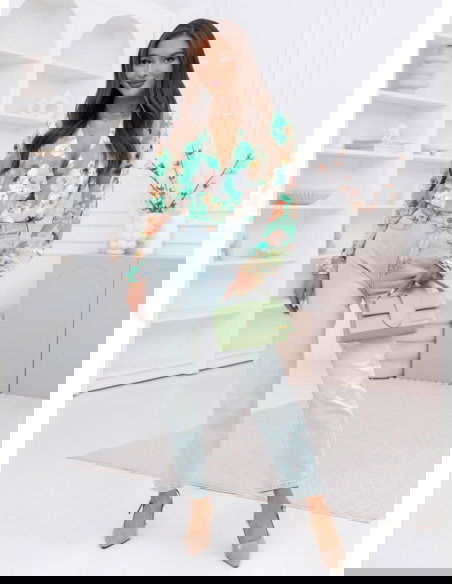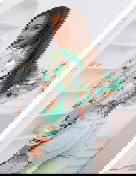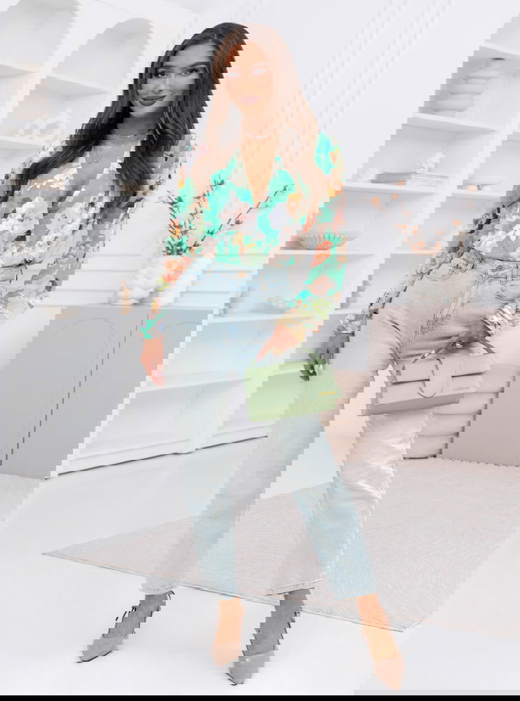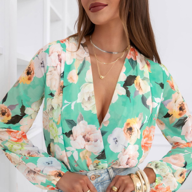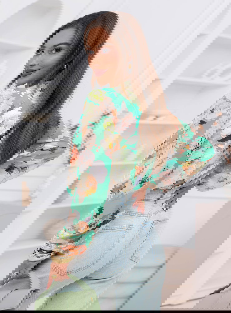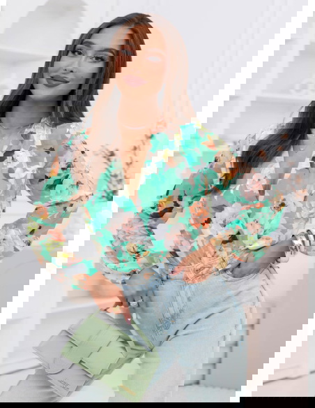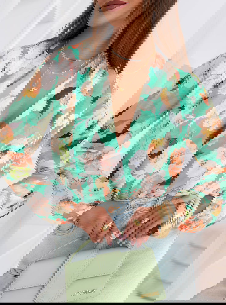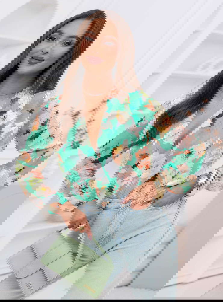 Zielone body w kwiaty z przekładanym dekoltem Nafeeza