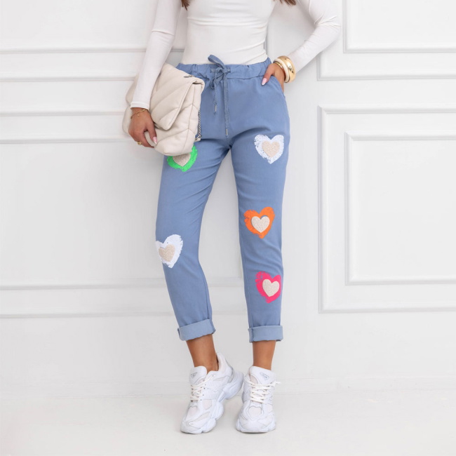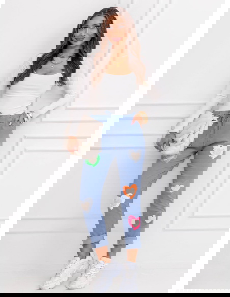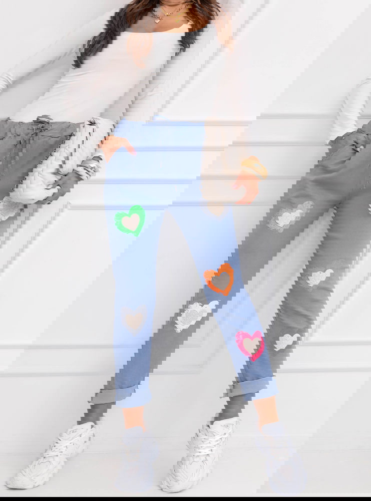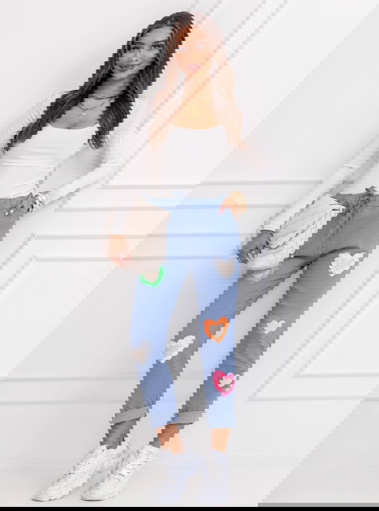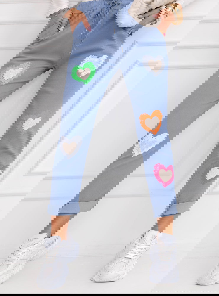 Niebieski kolor świetnie komponuje się z bielą, beżem i pastelami. Kolorowe serca ożywiają stylizację i dodają jej energii. Model sprawdzi się zarówno w miejskich zestawach, jak i podczas luźnych wyjść. To spodnie, które w prosty sposób odmienią codzienny look. Komfort idzie tu w parze z kobiecym wyrazem.