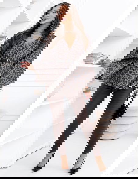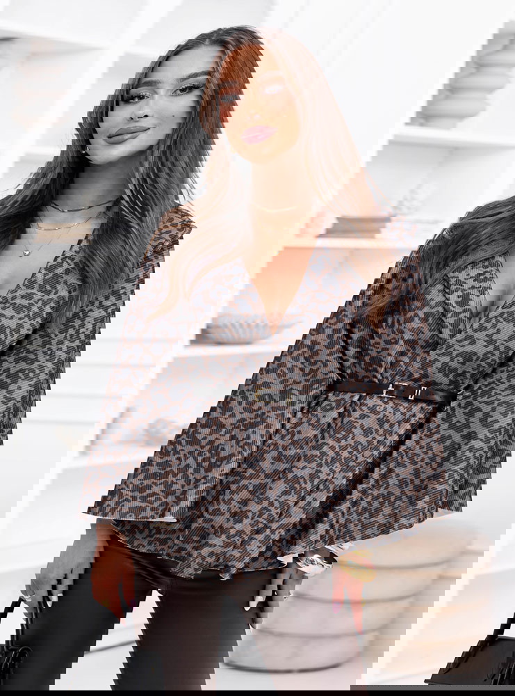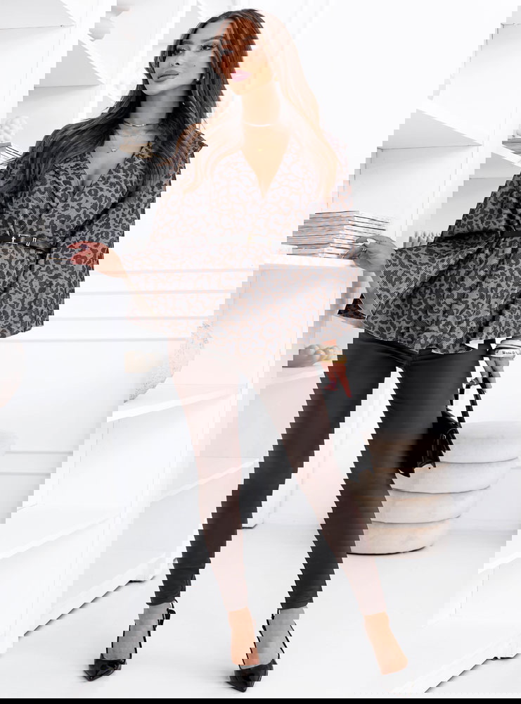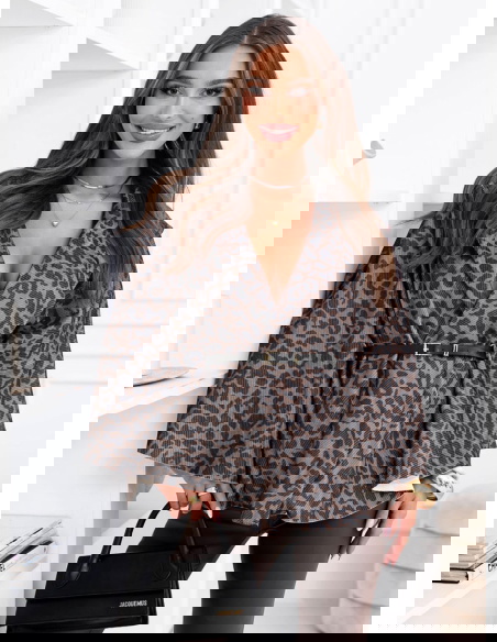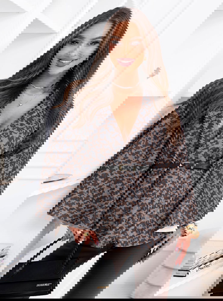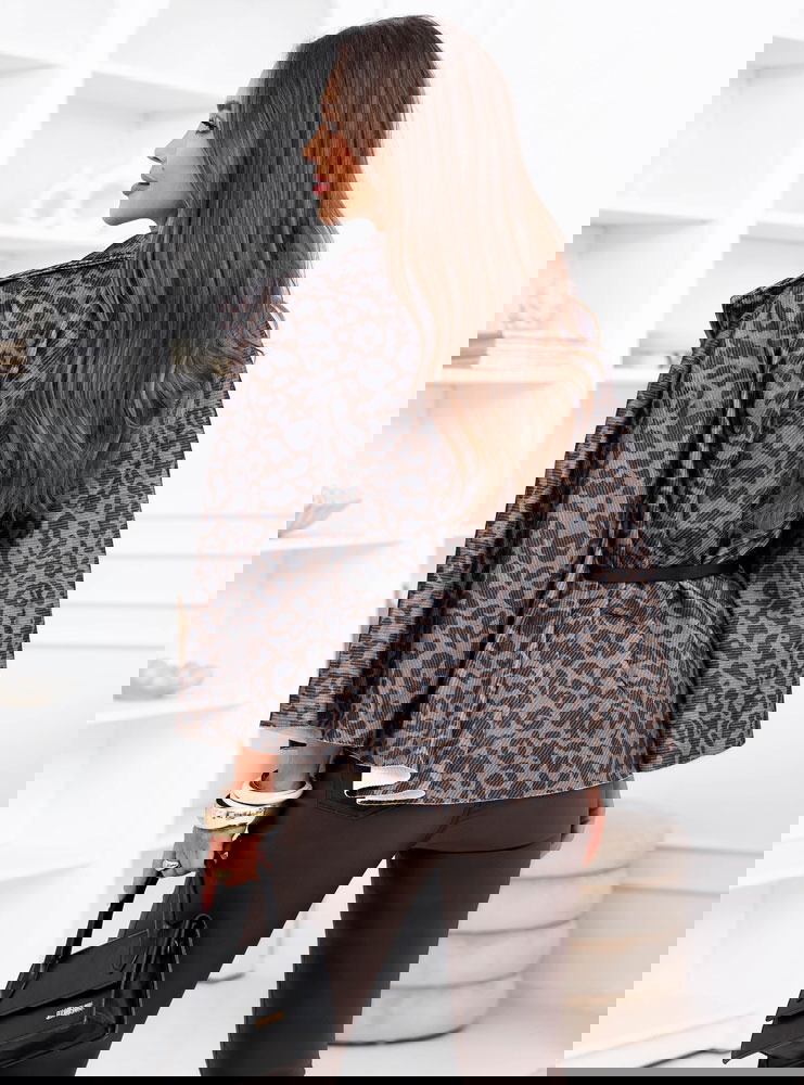 Kardigan z paskiem Saleema - wzór 3 to model o ponczowym kroju, który od razu przyciąga uwagę wyrazistym printem. Luźna forma bez klasycznych rękawów swobodnie układa się na sylwetce i daje efekt lekkiej, narzutkowej warstwy. Przekładany przód tworzy kobiecą linię dekoltu, a zapinany pasek w talii pozwala podkreślić proporcje i nadać całości bardziej dopracowany charakter. Materiał miękko opływa ciało i dobrze prezentuje się w ruchu.