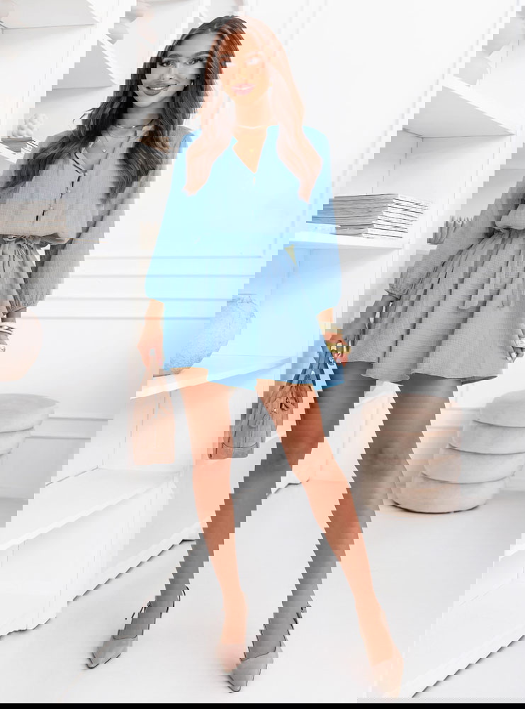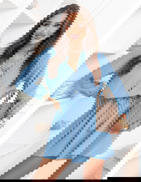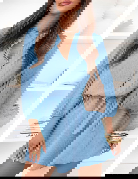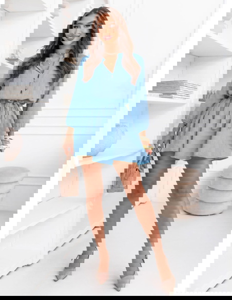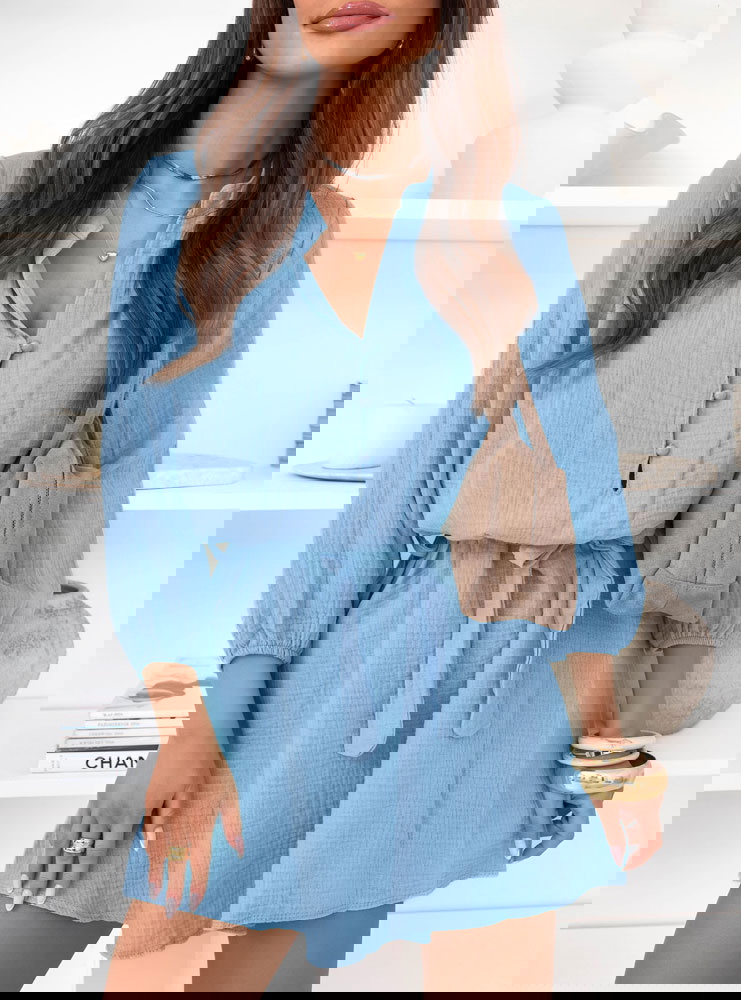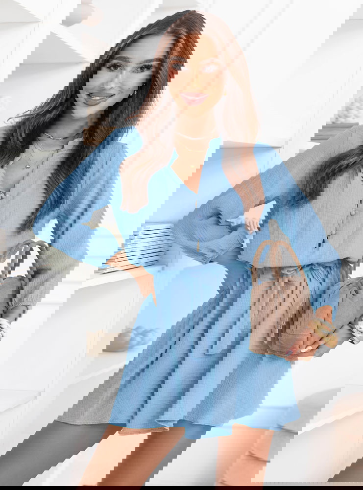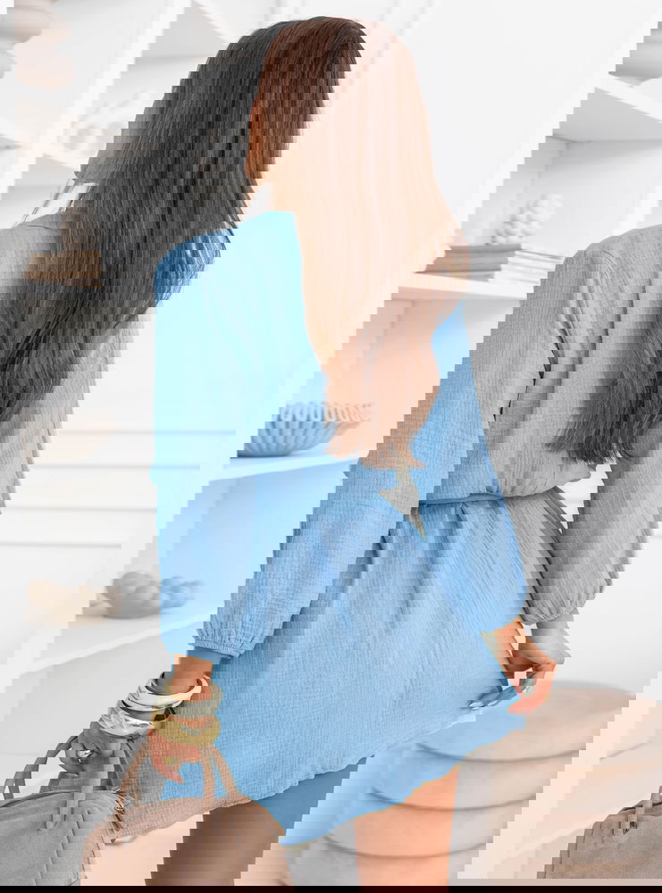 Błękitny odcień wprowadza świeżość i doskonale komponuje się z beżowymi, białymi oraz złotymi dodatkami. To sukienka, która łączy wygodę z kobiecą formą i naturalnym charakterem.